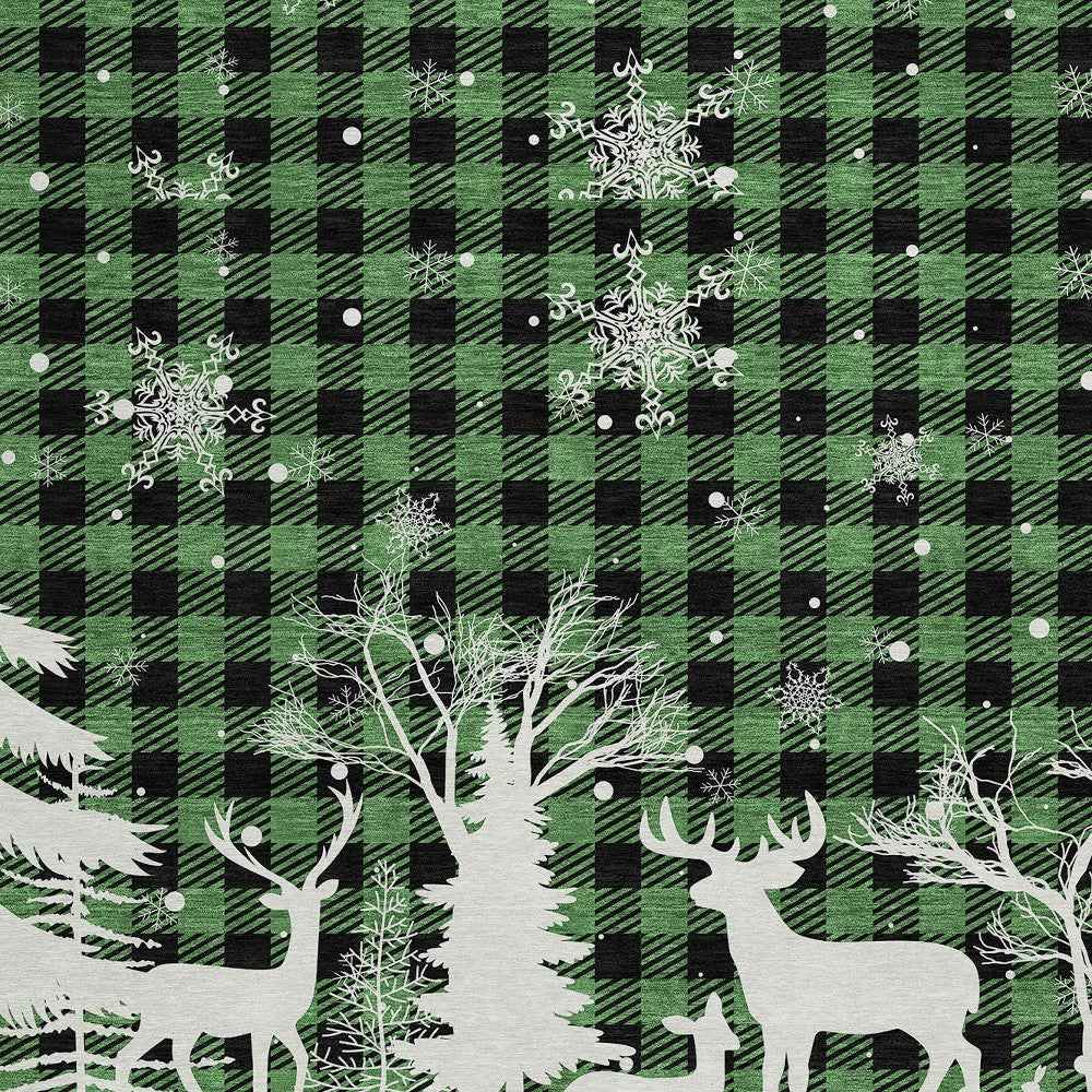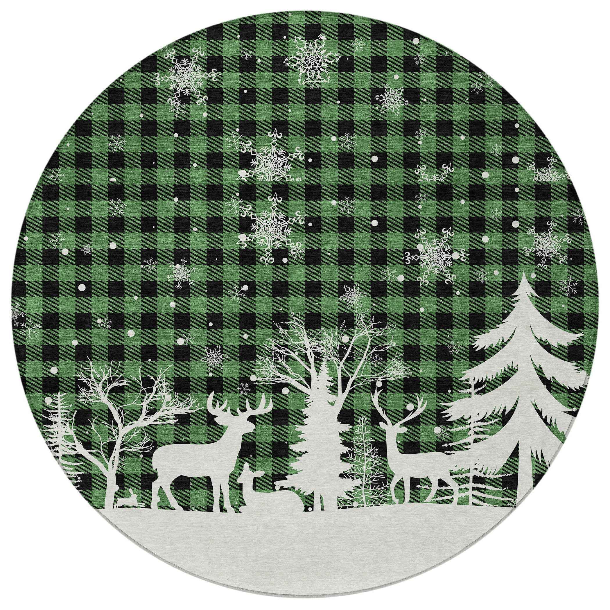 8' Green Black And Ivory Round Plaid Washable Indoor Outdoor Area Rug