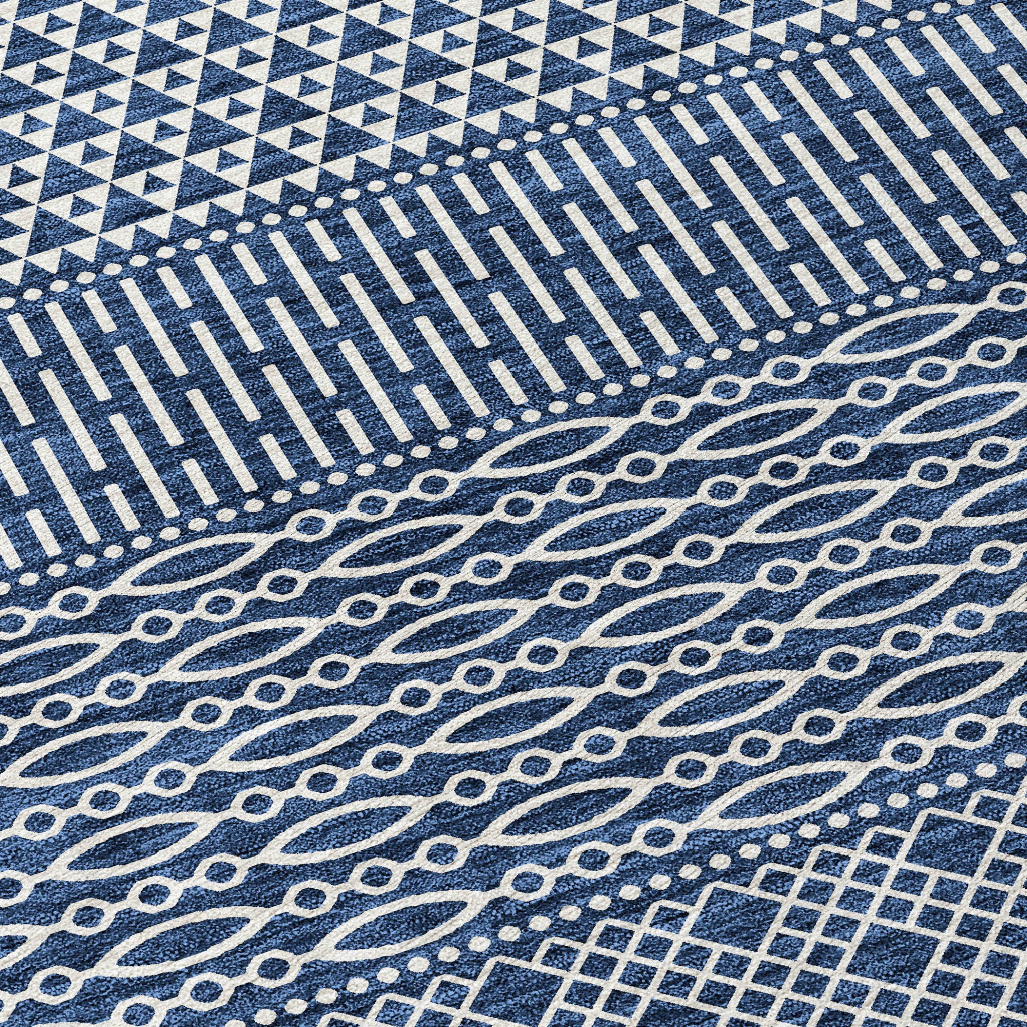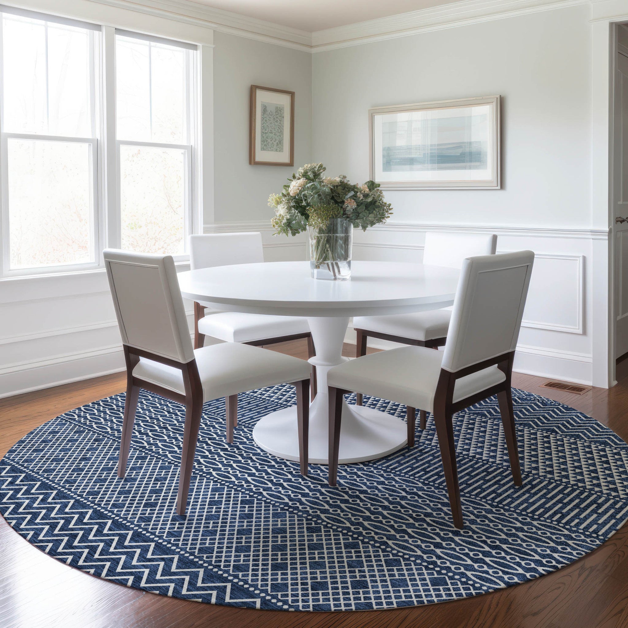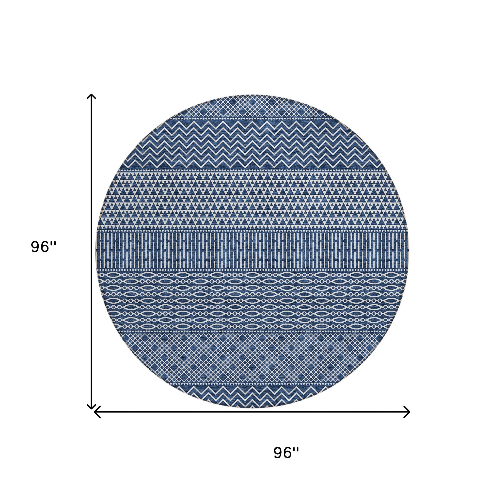 Set an inviting tone in your space with this 8-foot navy blue and ivory round chevron washable indoor outdoor area rug. This geometric round shaped rug features a chevron pattern in navy blue and ivory that combines a good looking print with a unique and updated shape. The mix of shape, color, and design gives this rug refreshing visual interest. Ideal for outdoor spaces or high traffic areas with kids and pets, this rug is made from heavy duty polyester that is stain resistant to help repel water, dirt, and stains. Makes a great way to dress up your patio, porch, or poolside, but also works well as a durable and easy to maintain option in the kitchen, family room, or mudroom. 96-inch h x 96-inch w x 0.19-inch d.