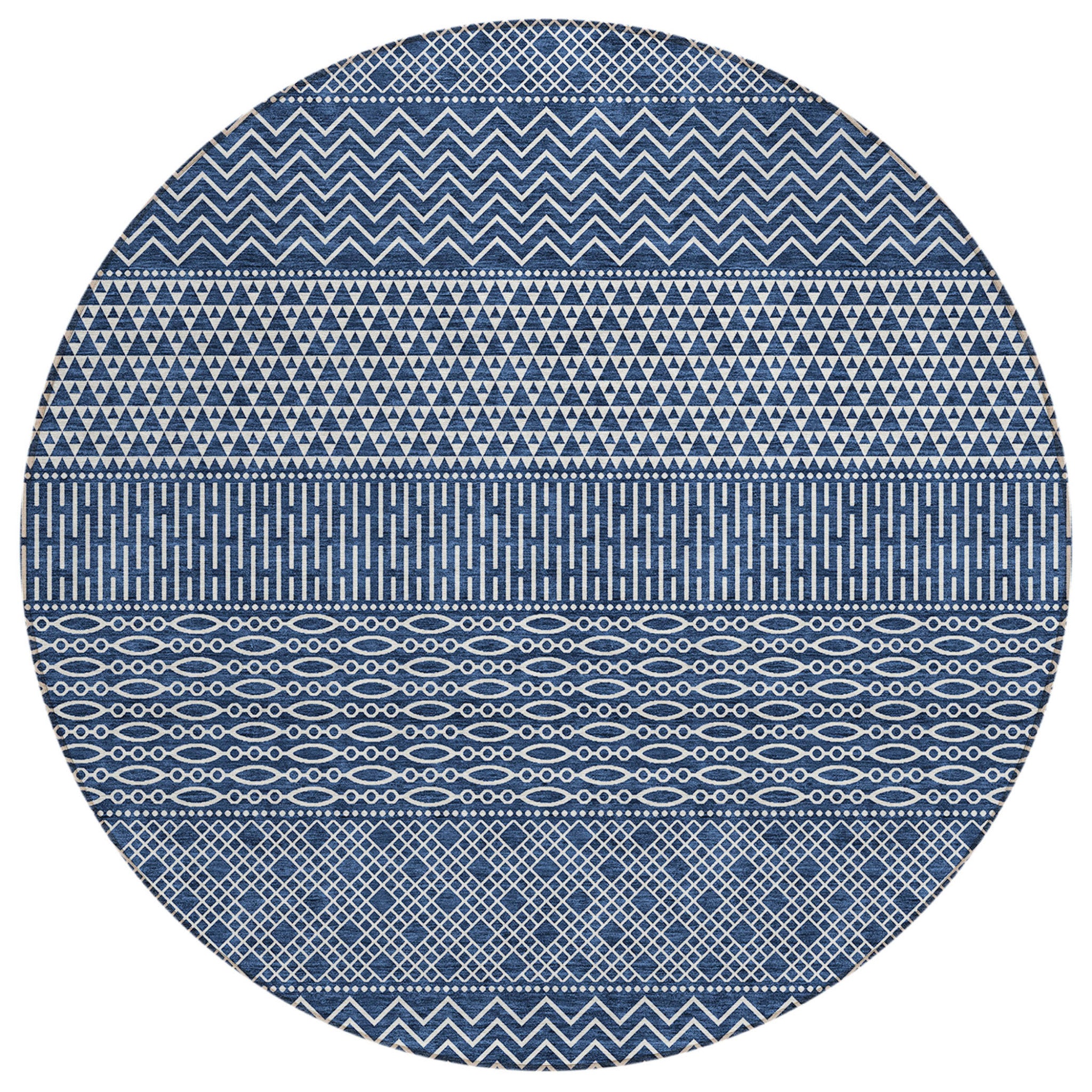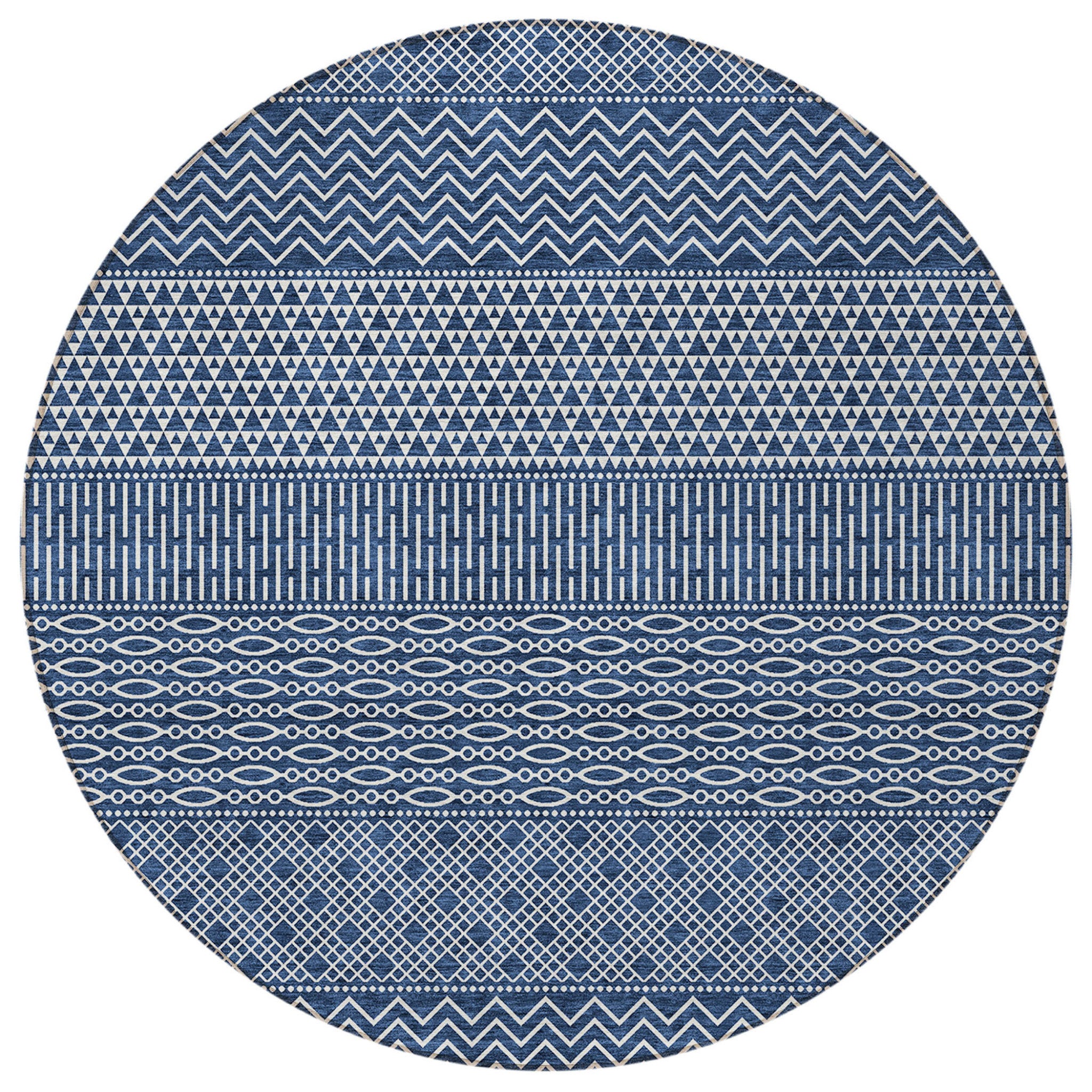 8' Navy Blue And Ivory Round Chevron Washable Indoor Outdoor Area Rug
