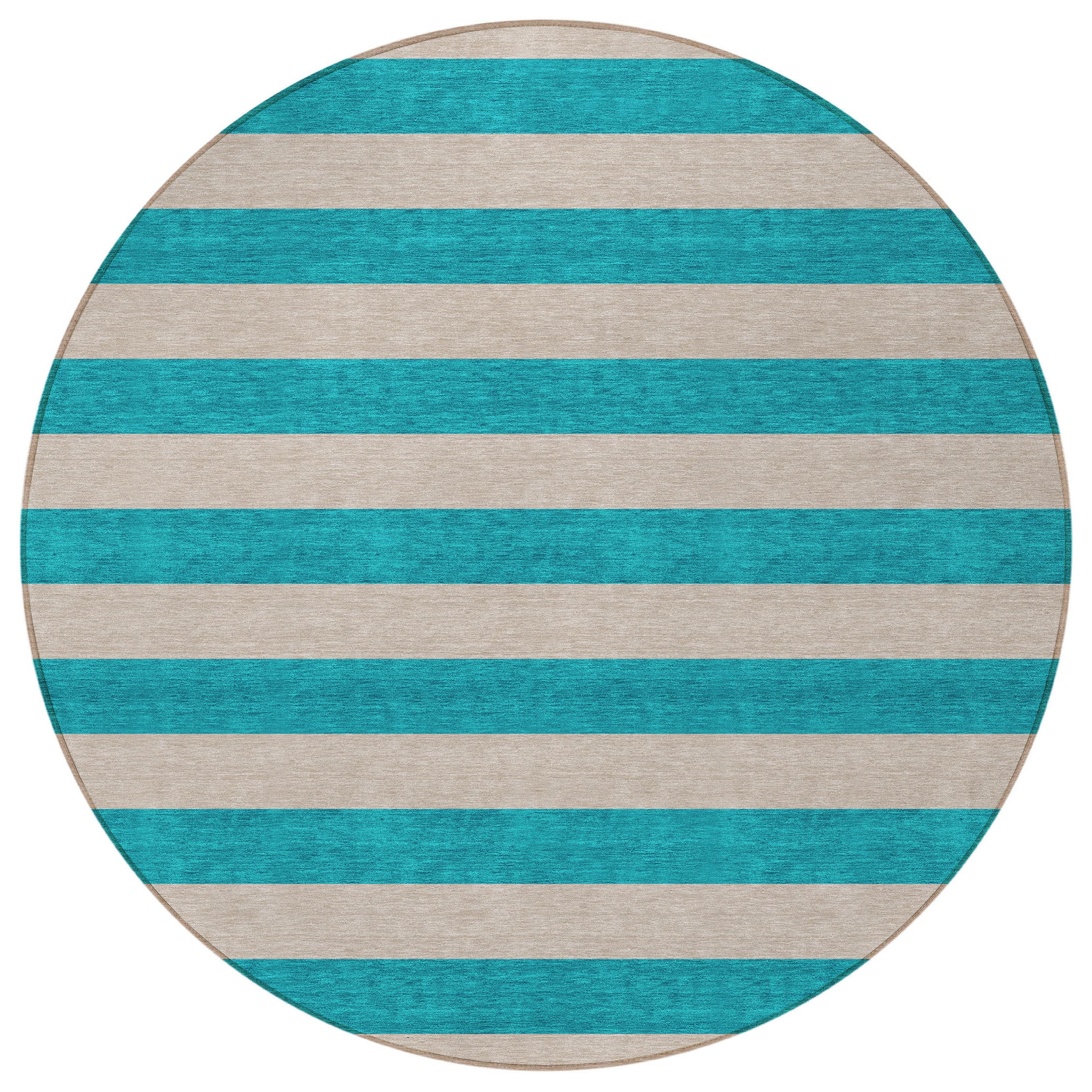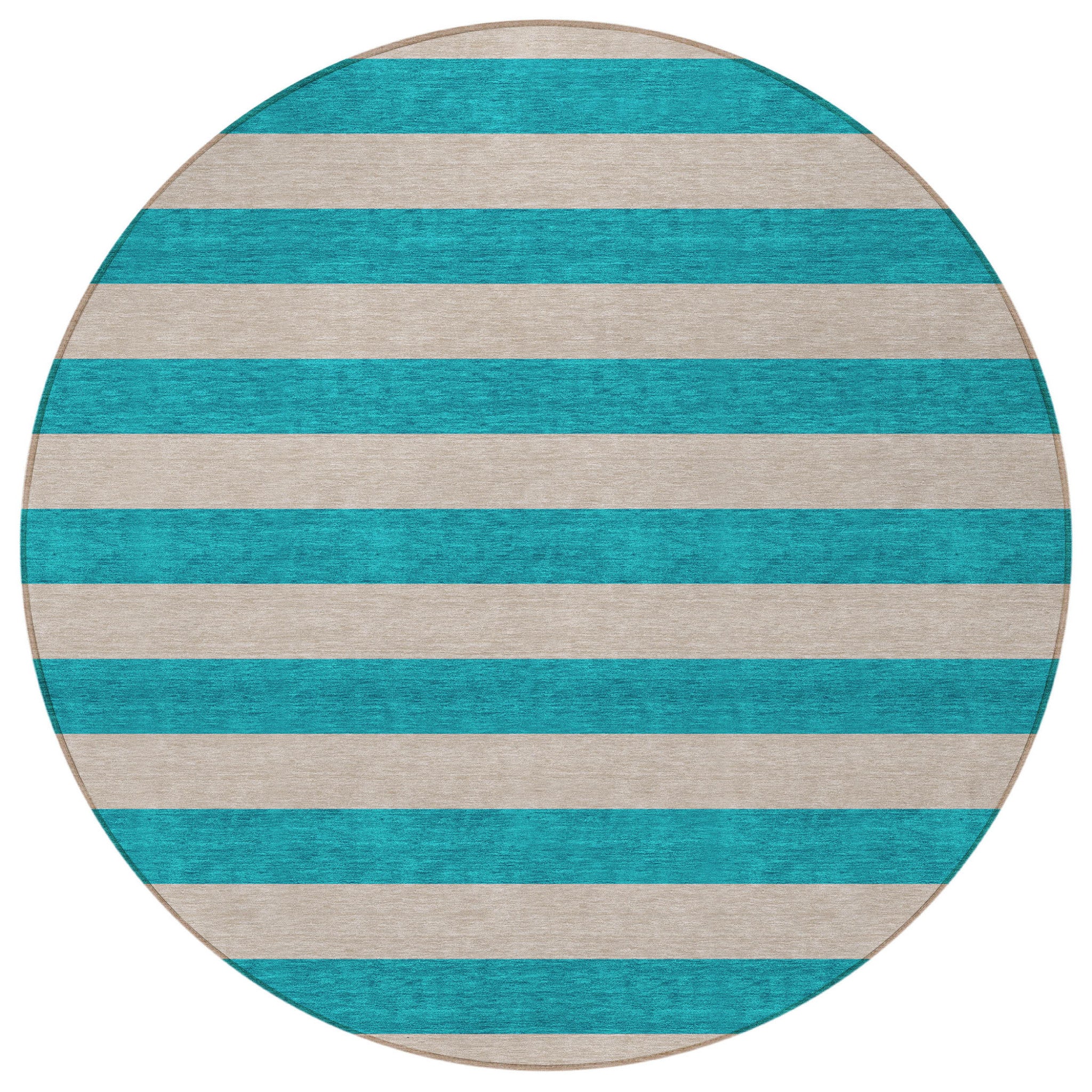 Add some artistry to your room with this 8-foot round turquoise round striped washable stain resistant non skid indoor outdoor area rug. This geometric round shaped rug features a striped pattern in turquoise that combines a good looking print with a unique and updated shape. The mix of shape, color, and design gives this rug refreshing visual interest. Ideal for spaces with kids and pets, this rug is stain resistant to help repel stains and spilled liquids. Place this area rug against a hardwood or tile floor and it will enliven your living space with style and sophistication. 96-inch H x 96-inch W x 0.19-inch D
