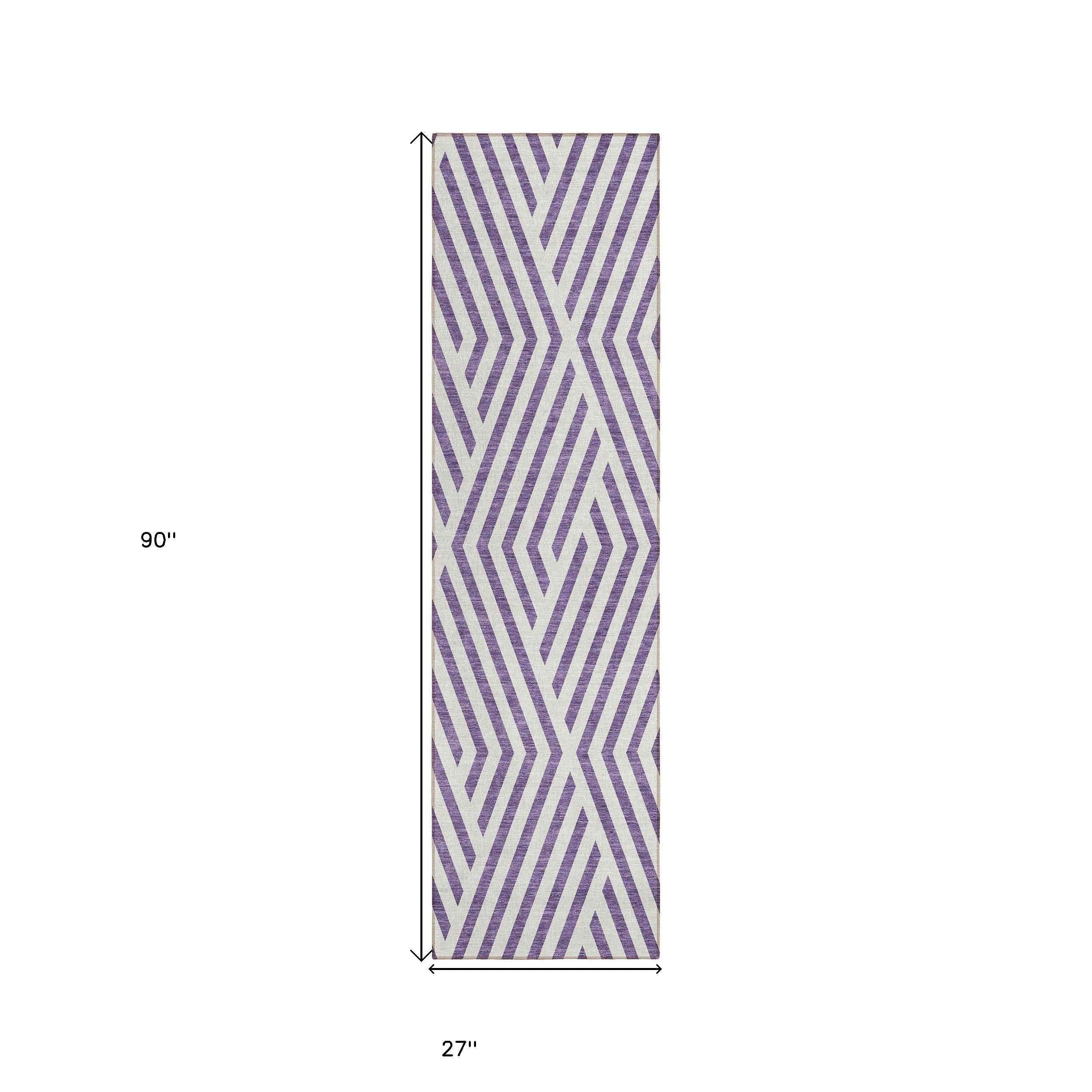 8' Runner Purple and White Geometric Washable Non Skid Indoor Outdoor Runner Rug
