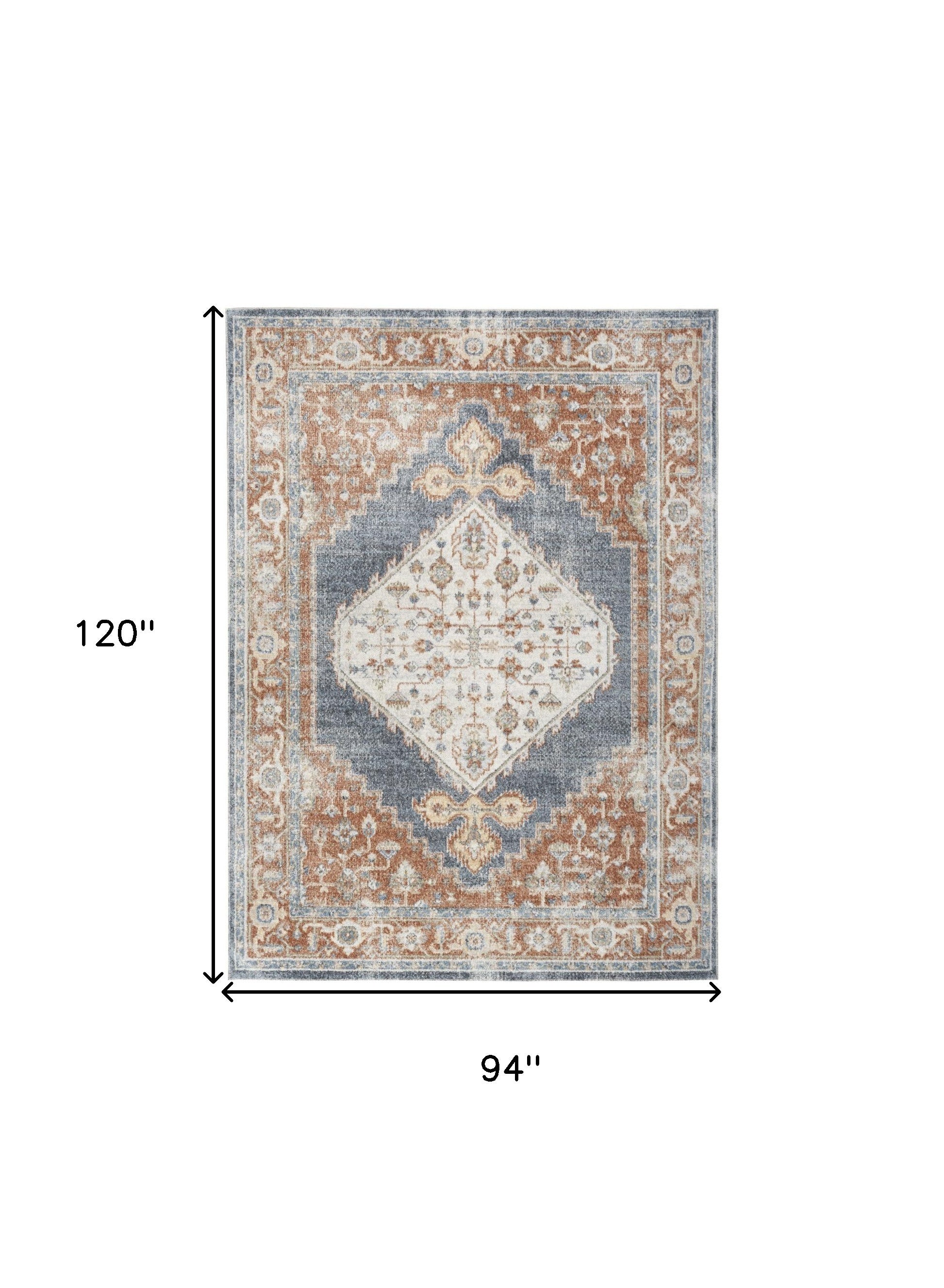 8' X 10' Denim Blue Oriental Power Loom Distressed Washable Area Rug