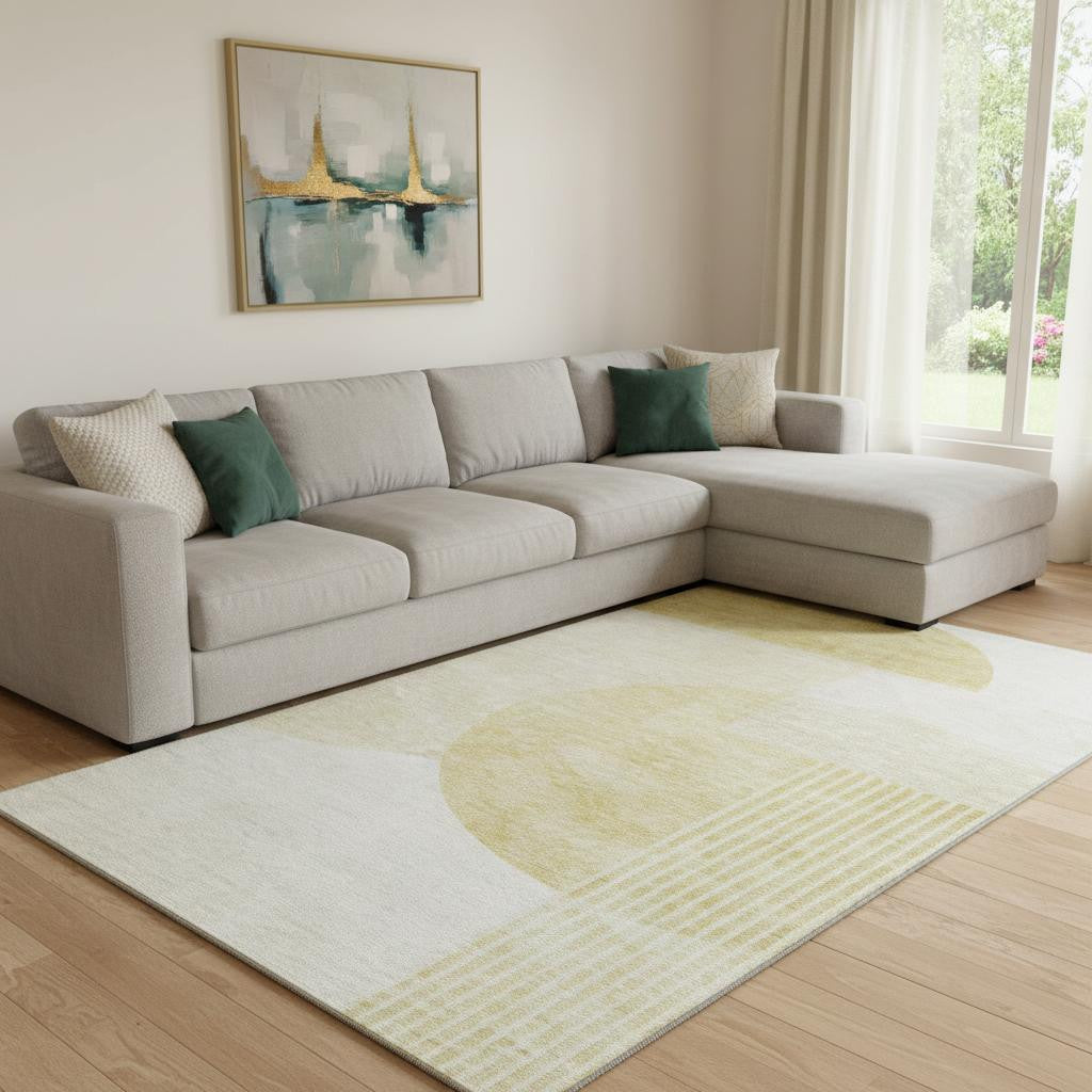Add great coloration and comfortable texture to your space with this 9-foot x 12-foot gold and ivory geometric washable area rug with uv protection. Ideal for spaces with kids and pets, this rug is stain resistant to help repel dirt and spilled liquids. Built to last, this rug crafted from polyester fibers is known for its durability and long lasting appeal. Rugs are a great way to showcase your style, hide imperfections, warm your home and reduce noise. This larger sized, transitional styled rug is ready to create a focal point or statement piece in your room. 108.00-inch h x 144.00-inch w x 0.39-inch d.