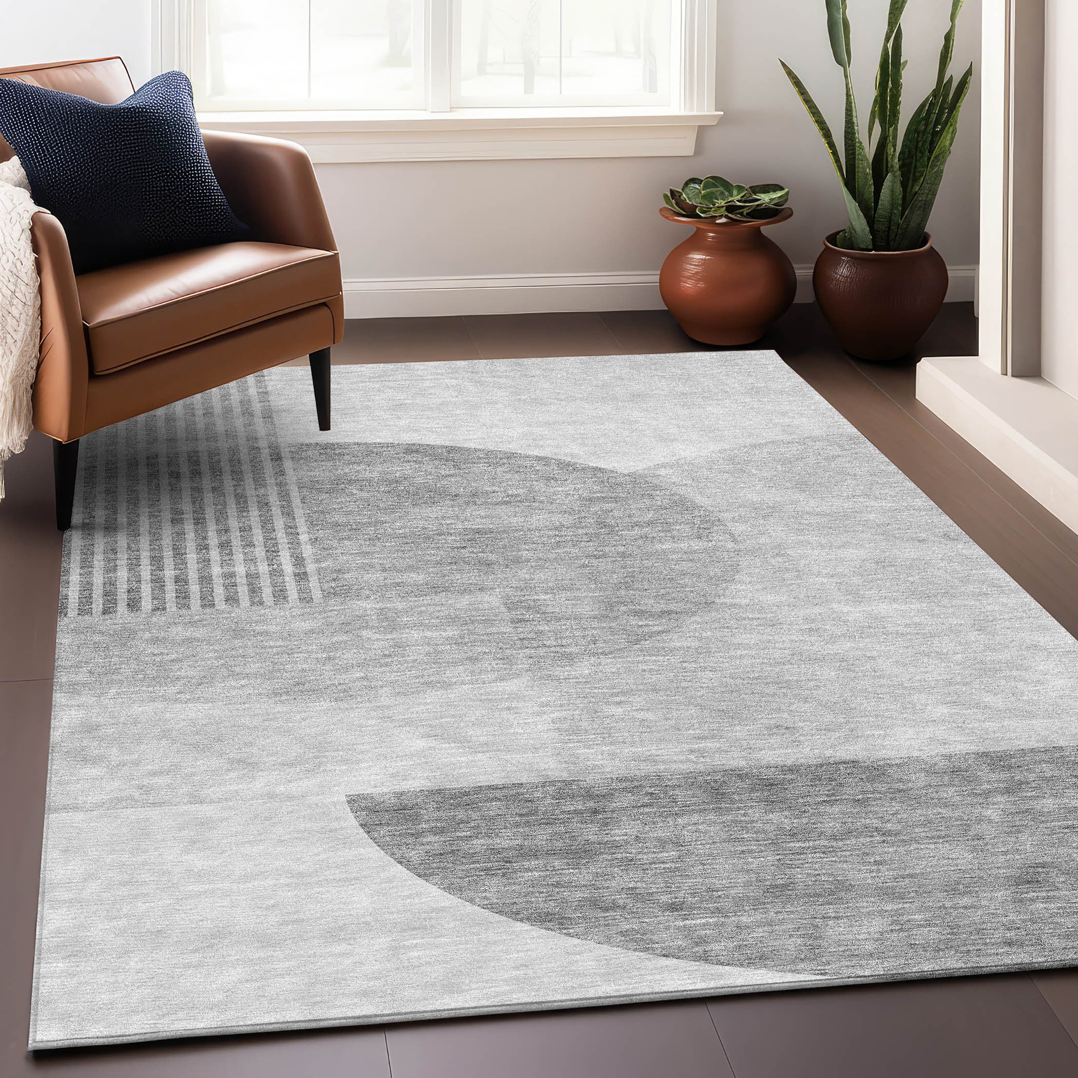 Set an inviting tone in your space with this 9-foot x 12-foot gray and silver geometric washable area rug with uv protection. Ideal for spaces with kids and pets, this rug is stain resistant to help repel dirt and spilled liquids. Built to last, this rug crafted from polyester fibers is known for its durability and long lasting appeal. Rugs are a great way to showcase your style, hide imperfections, warm your home and reduce noise. This larger sized, transitional styled rug is ready to create a focal point or statement piece in your room. 108.00-inch h x 144.00-inch w x 0.39-inch d.