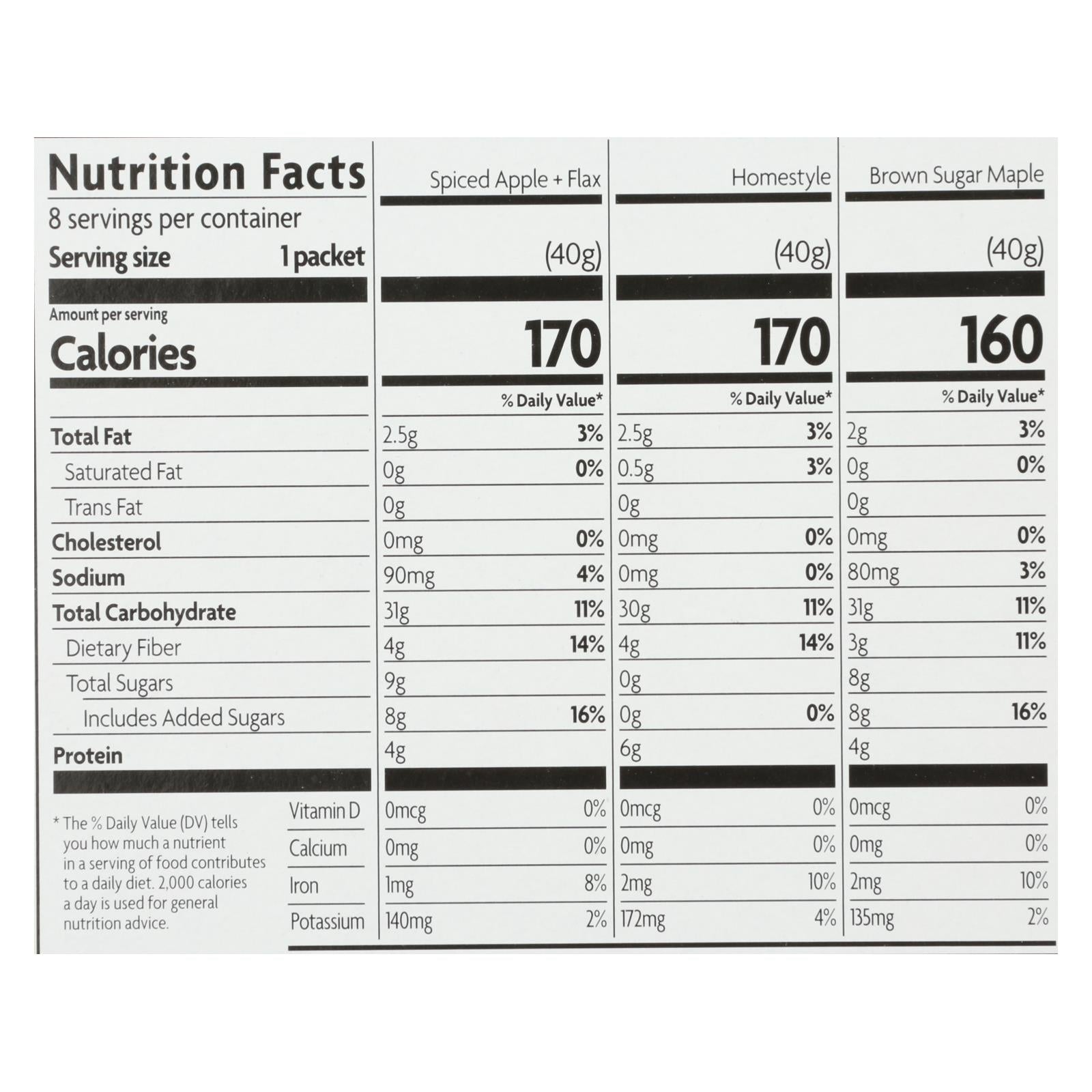 Nature's path gluten-free hot oatmeal variety pack is made with all non-gmo project verified and certified usda organic ingredients including rolled oats, flax seeds and rolled quinoa. One box of nature's path contains eight packets of gluten-free, vegan oatmeal and is low in fat, with only 20 calories from fat per serving. Nature's path oatmeal is an excellent source of fiber, with 16% of your daily value of fiber per serving, for a breakfast that provides long lasting energy.