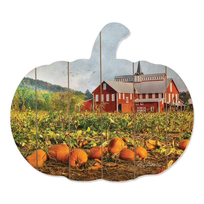 Add an air of fashion to your room and rejuvenate the space with this red barn pumpkin patch unframed print wall art. This unique and novel shaped art will bring some dimension and artistic design to your wall. This print is a visual artistic expression that allows you to decorate your space in style. Reproduced for you on wood, this hanging decorative accent will be a trendy and fashionable way to dress your walls in a rustic and modern farmhouse vibe. Hang on your wall to add some up to date fashion and decoration. Instantly liven up your space with this art that brings color and dimension to your walls. 15 inches H x 17.25 inches W x 1 inches D
