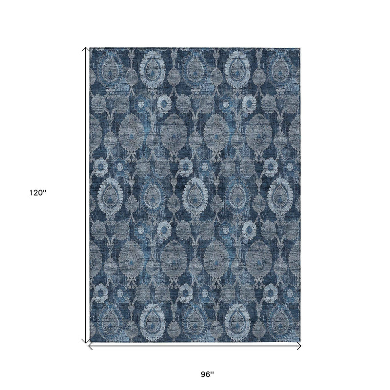 8' X 10' Navy Blue And Denim Blue Damask Washable Indoor Outdoor Area Rug