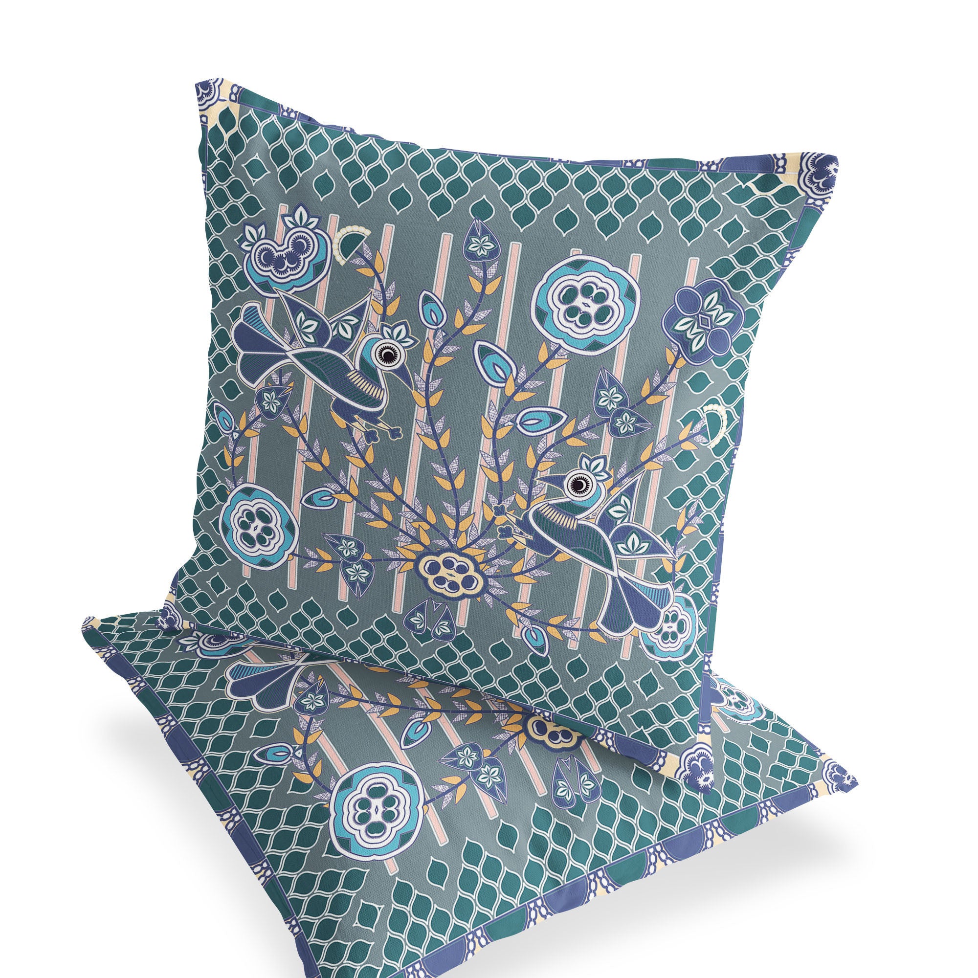 Set of Two 16" X 16" Blue and Gray Peacock Blown Seam Floral Indoor Outdoor Throw Pillow