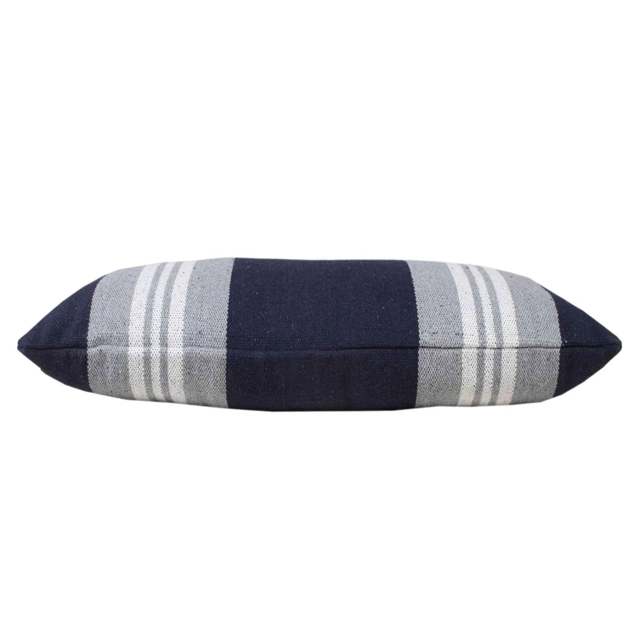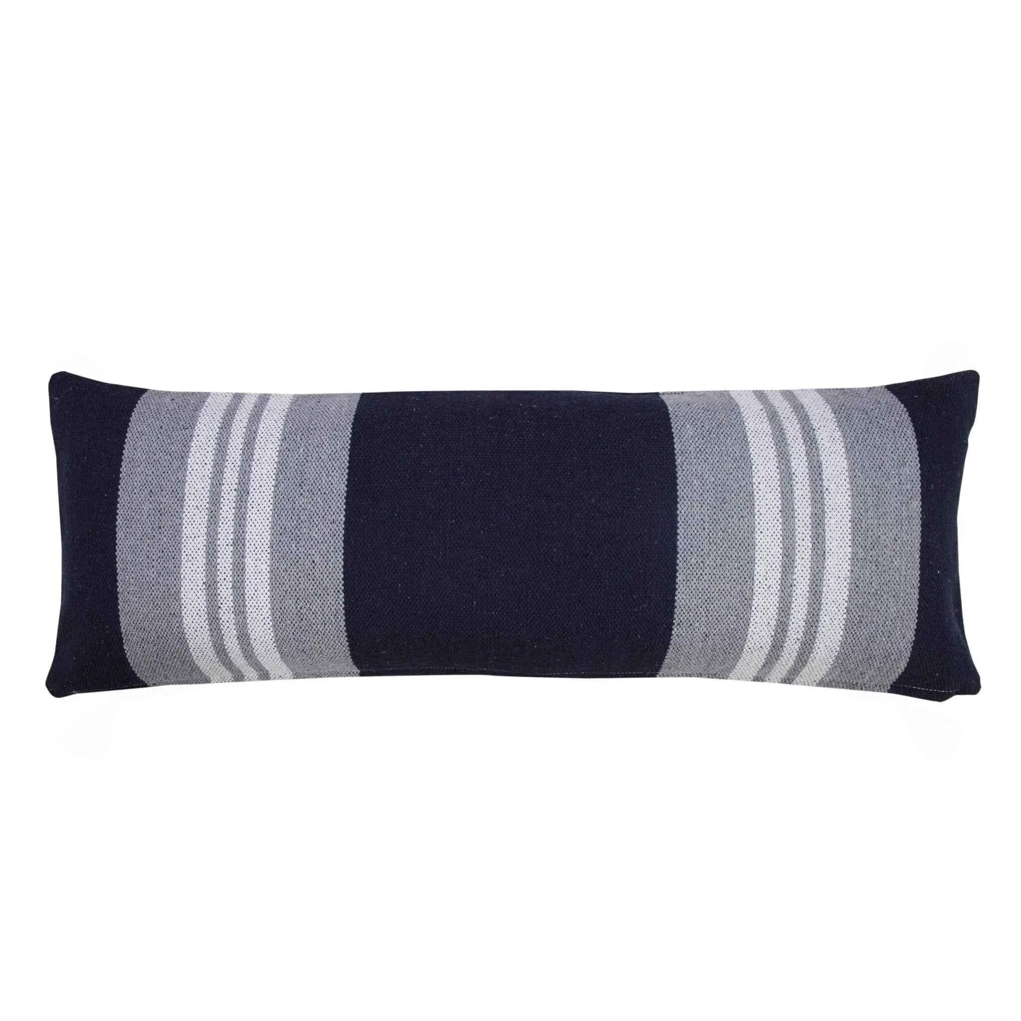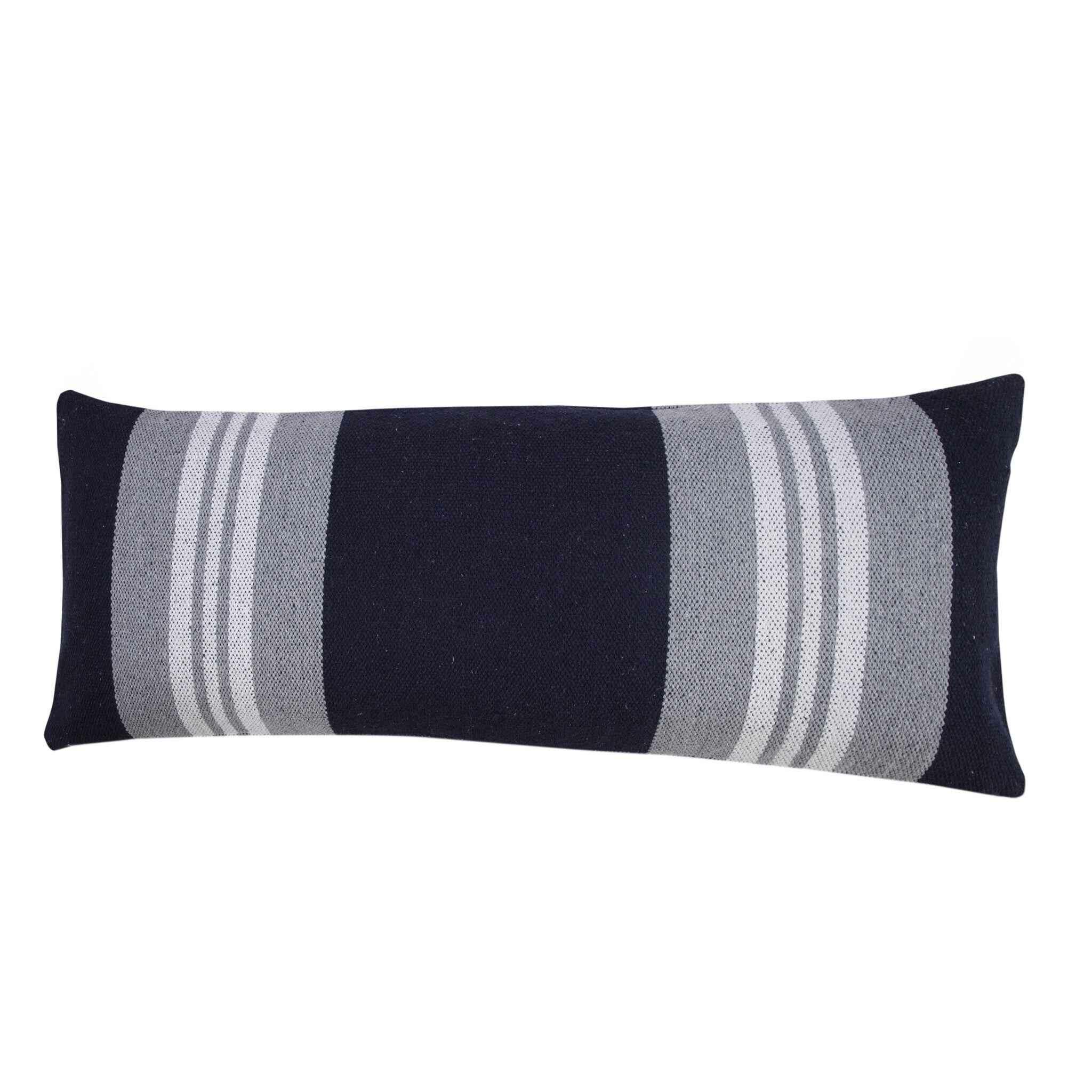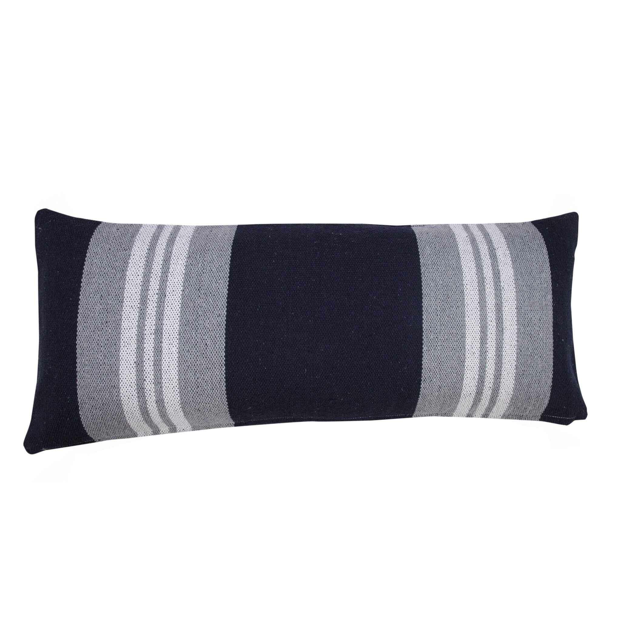 This 14" x 36" navy gray and white 100% cotton coastal zippered pillow will add a beautiful decorative accent to your decor. This super soft decorative pillow is expertly made of high grade, long lasting 100% cotton in a navy gray and white coloration. Decorative throw pillows not only add color and dimension to your space but can be comfy and supportive when you are lounging and cuddling as well. Decorative pillows are a great way to change up the look and feel of your space easily and quickly. 14" H x 14" W x 36" D