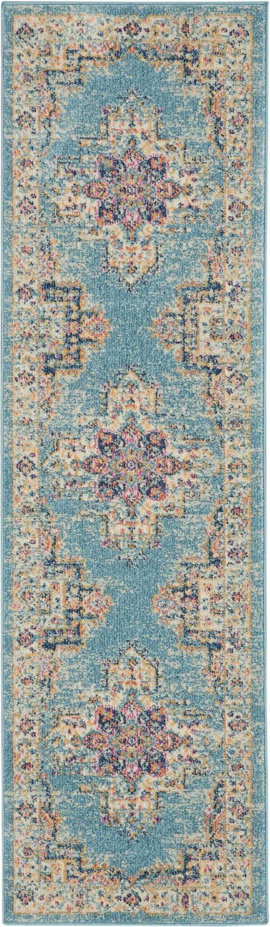 Infused with on-trend jewel tones and Persian-inspired patterns, this Light Blue Distressed Medallion Runner Rug will elevate the aesthetics of any transitional living space. The distressed ocean blue backdrop is accented with the intricate decorative medallion in the center framed with a dense border upholding a vintage value. To ensure enhanced durability with low maintenance, this Turkey-made rug is skillfully crafted with 100% polypropylene which is inherently stain-resistant to stand up to the stains and spills of indoor areas with moderate foot traffic. The advanced power-loomed construction adds to its optimum quality and smooth surface texture for a soft and luxurious underfoot. Standing on the verge of traditional charm and modern grace, the subtle hues of this runner rug will induce a calm and inviting tone into your home. 2'2" x 7'6"