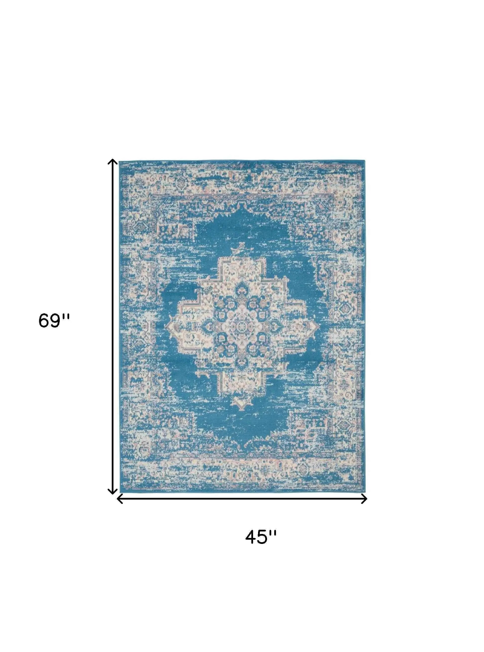 This 4' x 6' blue damask power loom area rug, is a great way to add warmth to a room. This rectangle shaped rug features a damask design in blue to give it visual interest. A classic shape marries with good looking design for your space This superior Turkish rug represents the highest quality and is built to last. Area Rugs help to give warmth and sense of home to your space. .50" H x 45.00" W x 69.00" D