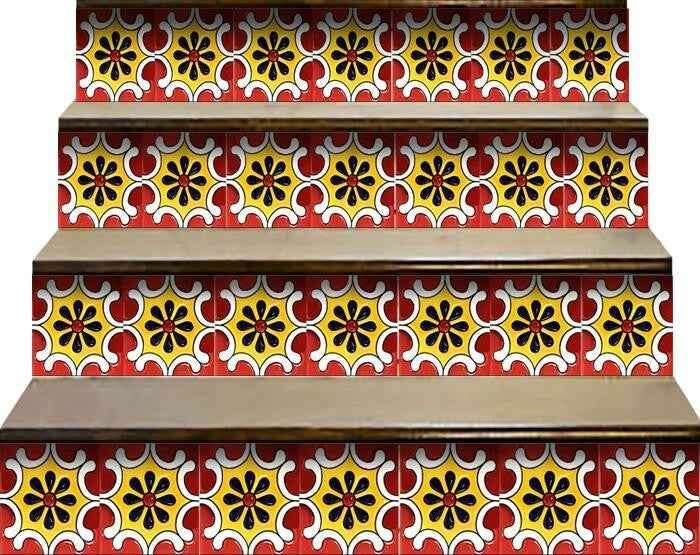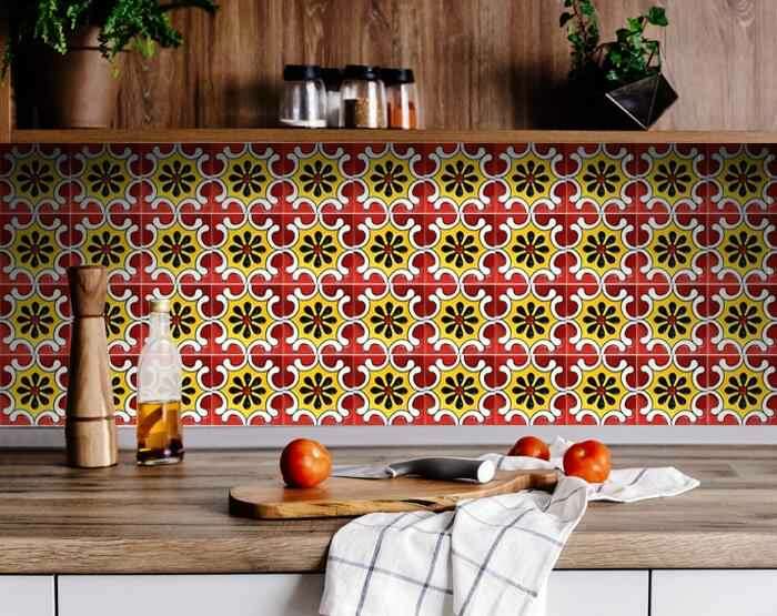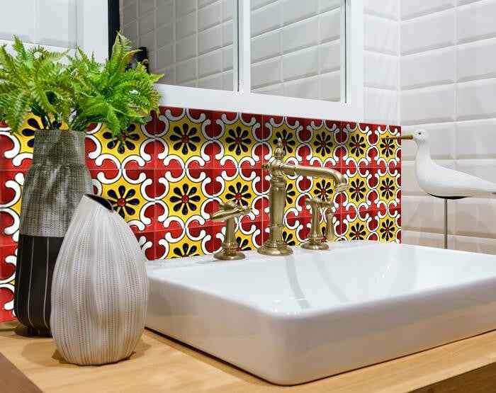 The possibilities are endless with these 7" x 7" Festival Red and Yellow Peel and Stick Removable Tile stickers. These fabulous peel and stick tiles will add sophisticated flair and design to your kitchen backsplash, fireplace mantel, stair treads, half wall, bathroom or nook. These 7" square tile stickers are an easy, no mess solution to complete a personalized and colorful room makeover. Easy to apply on any clean dry flat surface, and easy to remove. Multi use and multi-room appeal make this design option is perfect for renters, landlords, college students and homeowners alike. Peel and stick tile decals make it easy to turn your space into a home. Removable without damage to surfaces. One kit contains 24 stickers. Kit includes a single repeating design.