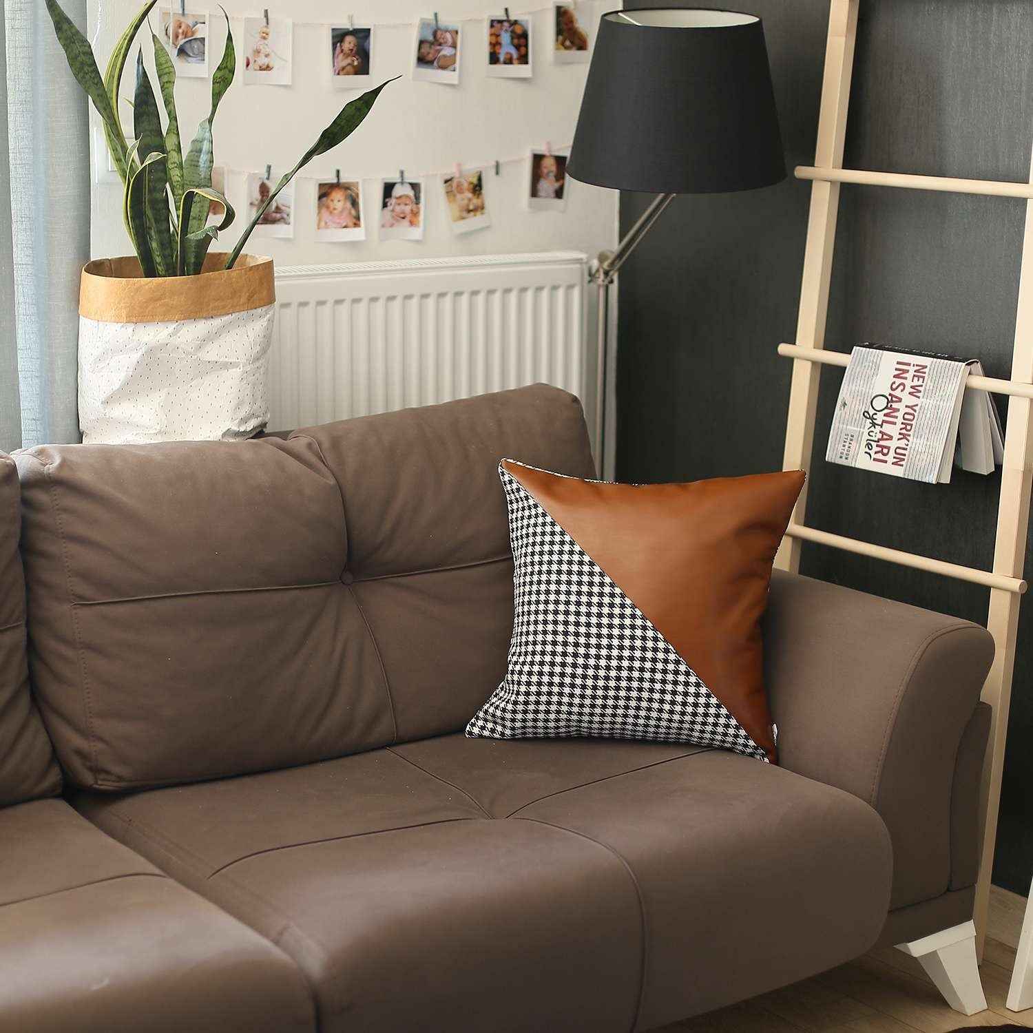 Houndstooth Brown Faux Leather Throw Pillow