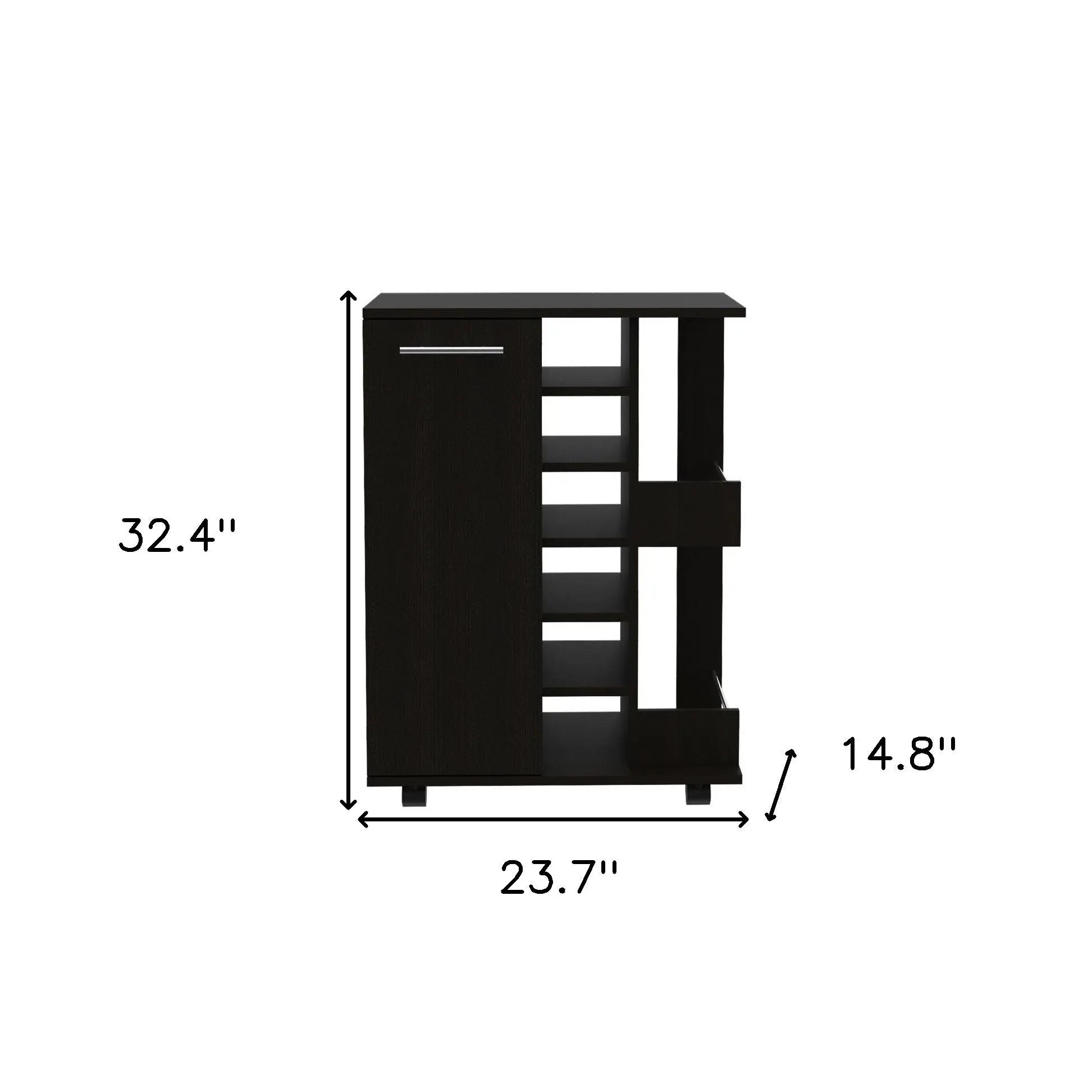 This black rolling bar cart with wine storage is the perfect addition to your contemporary home decor. With its sleek black color and stylish design, this bar cart will enhance the look of any space. The freestanding cart features a display stand cabinet with shelves, allowing you to showcase your favorite barware and spirits. The cabinet is made from high-quality particle board, ensuring durability and longevity. The bar cart also includes wheels, making it easy to move around as needed. And let's not forget about the wine storage capabilities. With the capacity to hold up to 6 wine bottles, this cart is a must-have for wine enthusiasts. Elevate your entertaining experience with this functional and stylish bar cart. 32.4-inch H x 23.7-inch W x 14.8-inch D
