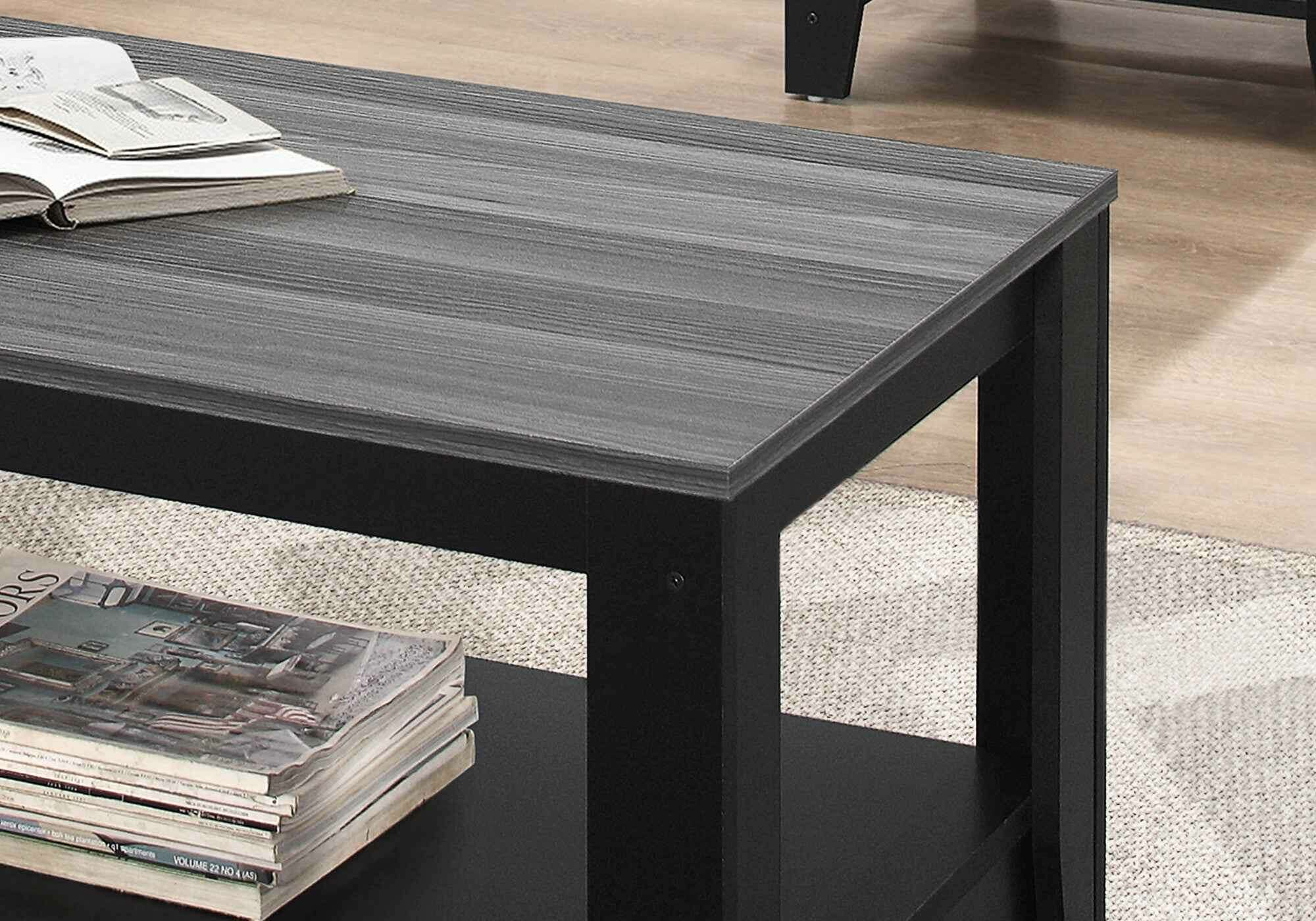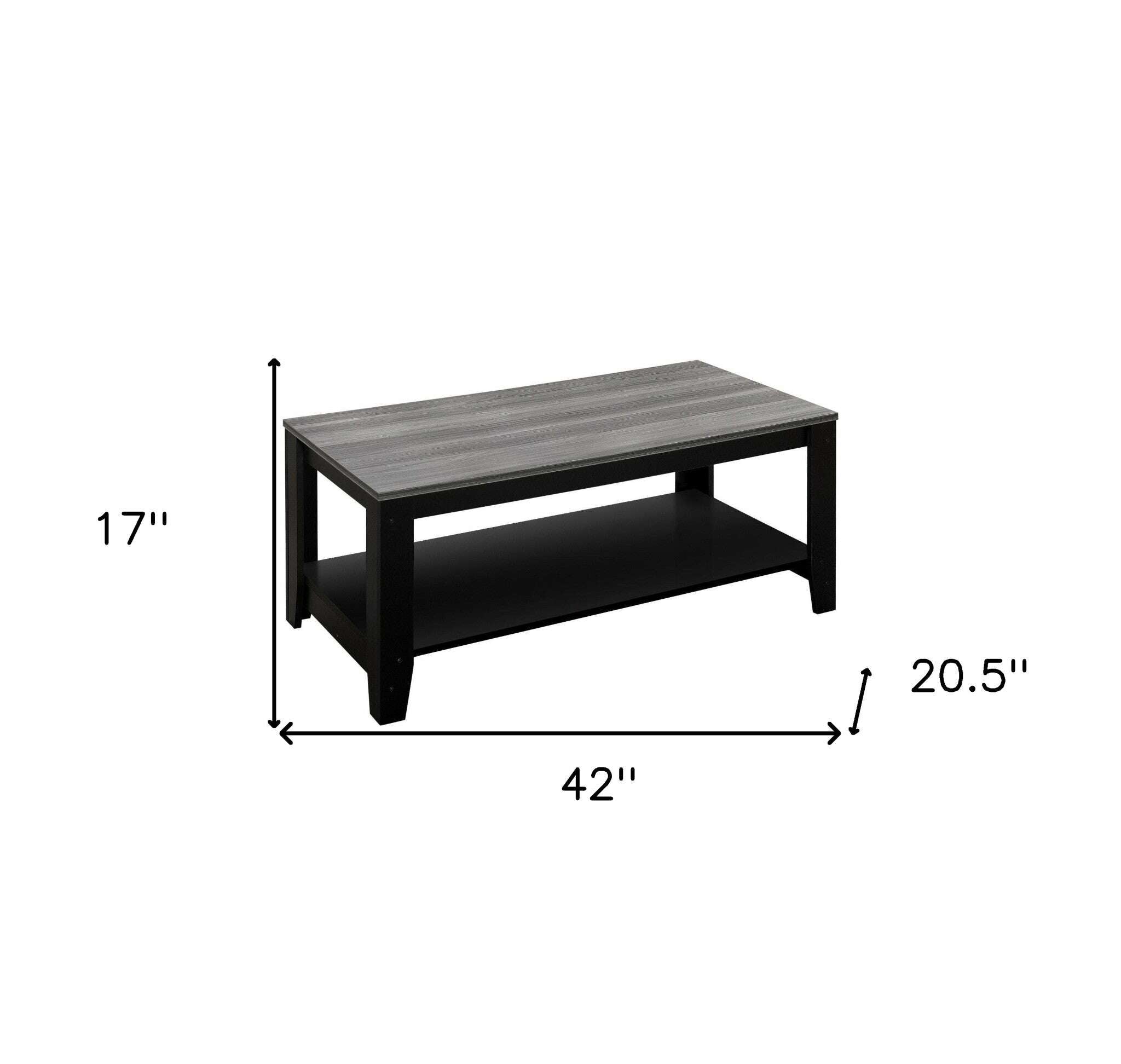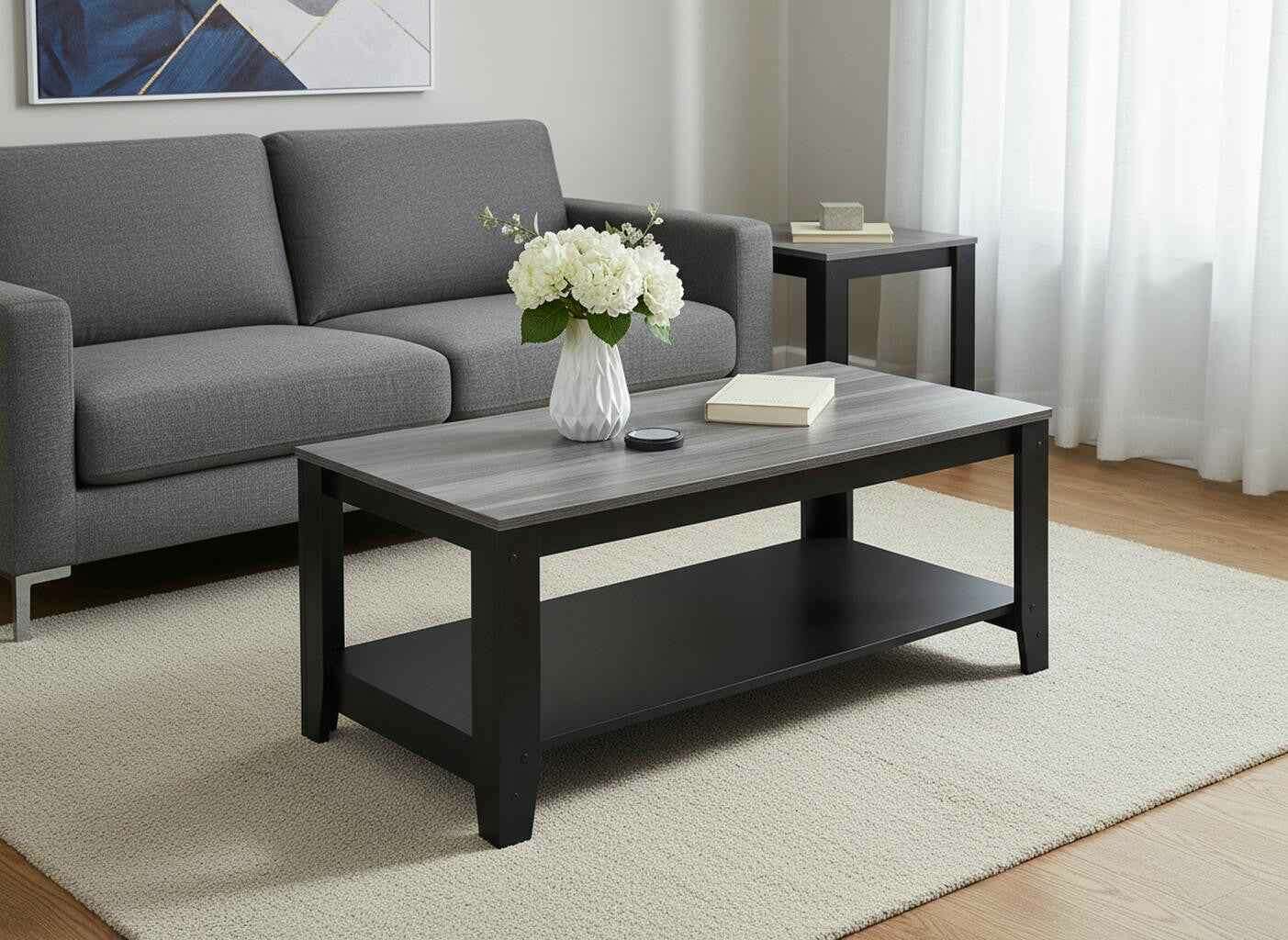 This coffee table set is just what you need to get your living room or lounge area set up and ready. Offering a nice color combination, the top of this manufactured wood table is gray, while the base compliments it nicely in black. Includes a single shelf for handy storage or display space. This rectangular table is an classic yet updated way to accent your room. It has a fresh design that will definitely breathe some fresh air into your interior. This coffee table is the sturdy, reliable and stylish answer to your living room needs. 17-inch H x 42-inch W x 20.5-inch D