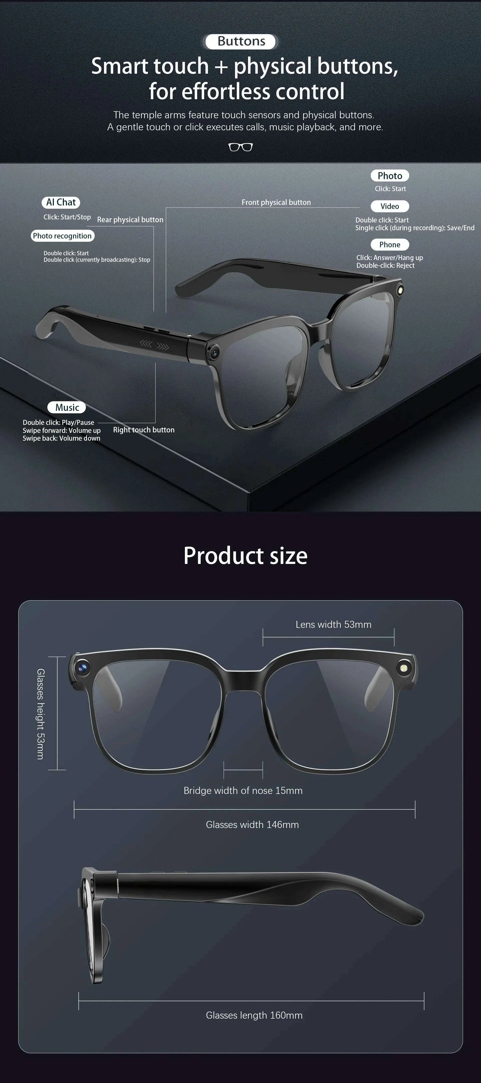 Function: Music,Camera,VIDEO,Voice Assistant,calling,Sun protection,Anti-blue light,AI translator,Chat gpt,Ai
