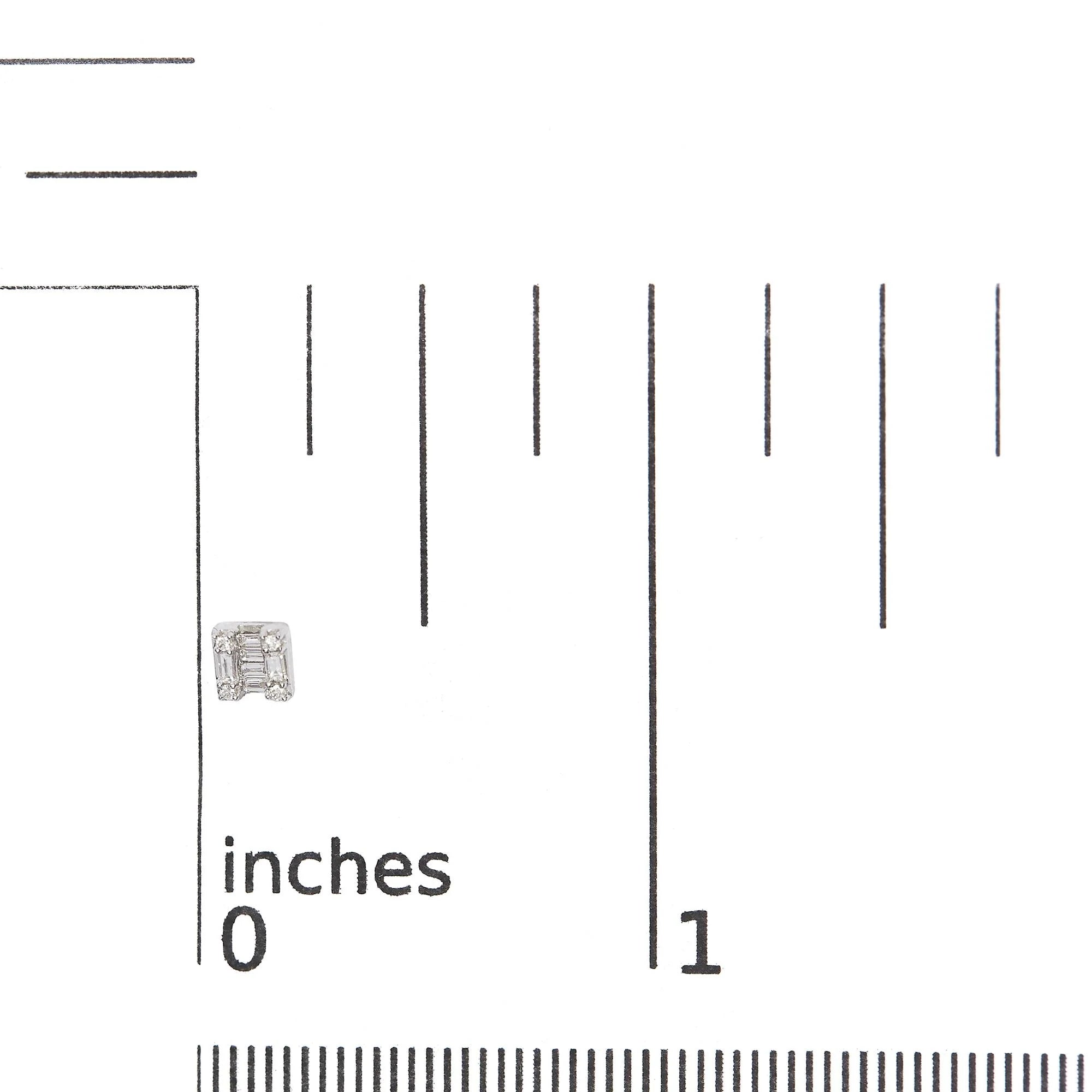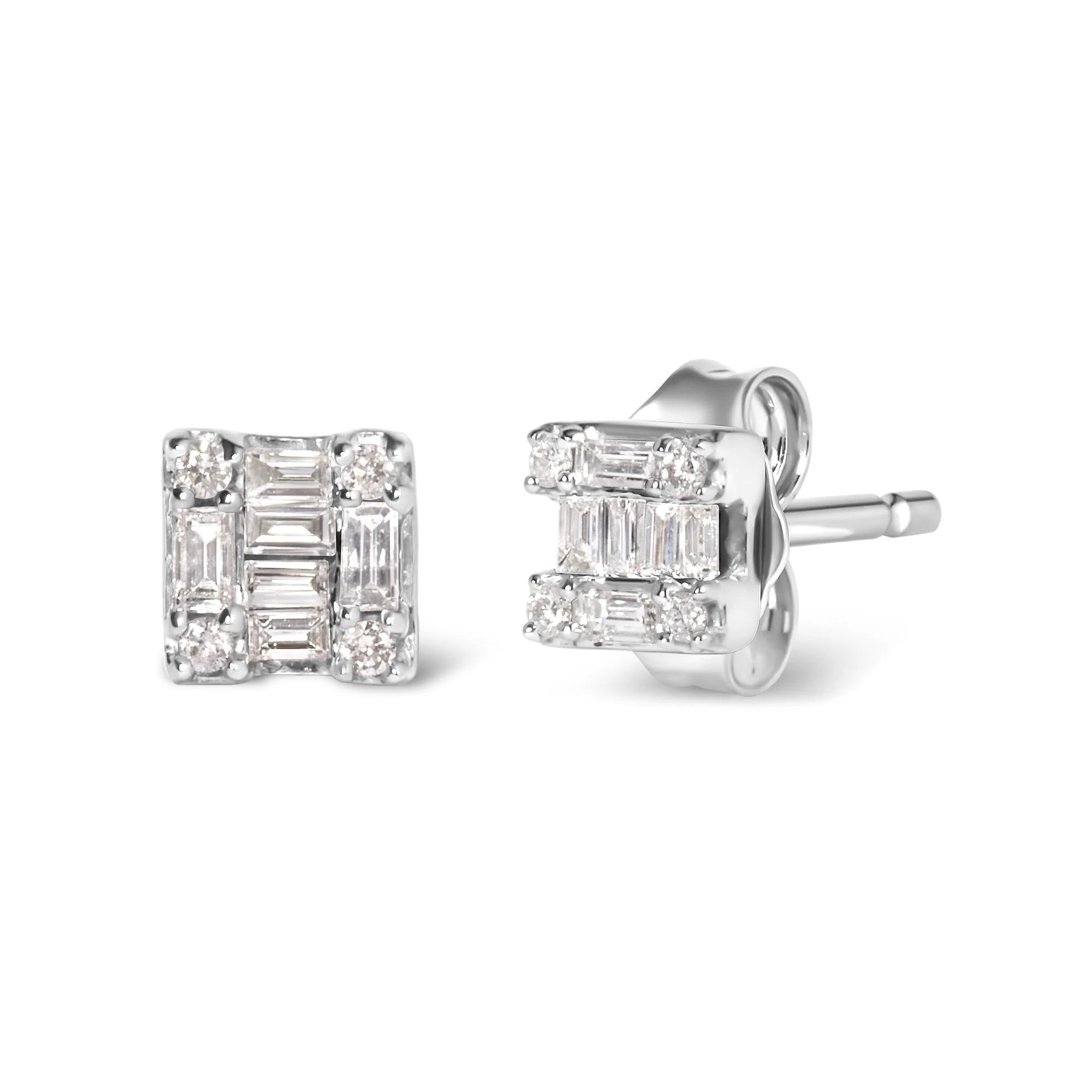 Introducing a mesmerizing masterpiece crafted with exquisite details. Behold these 10K White Gold Stud Earrings, adorned with a dazzling mosaic of round and baguette diamonds. With a total weight of 1/7 cttw and 20 diamonds, these earrings radiate elegance and grace. The fusion design effortlessly combines classic and contemporary styles, making it an ideal accessory for any occasion. The diamonds, sourced from nature itself, boast a captivating H-I color and are set in a channel setting, ensuring their brilliance is showcased to perfection. These earrings are delicately finished with push back findings, providing comfort and security. Designed for women who appreciate the finer things in life, these earrings are a testament to sophistication and beauty. Indulge in this opulent treasure and experience the allure of diamonds that will leave everyone spellbound.