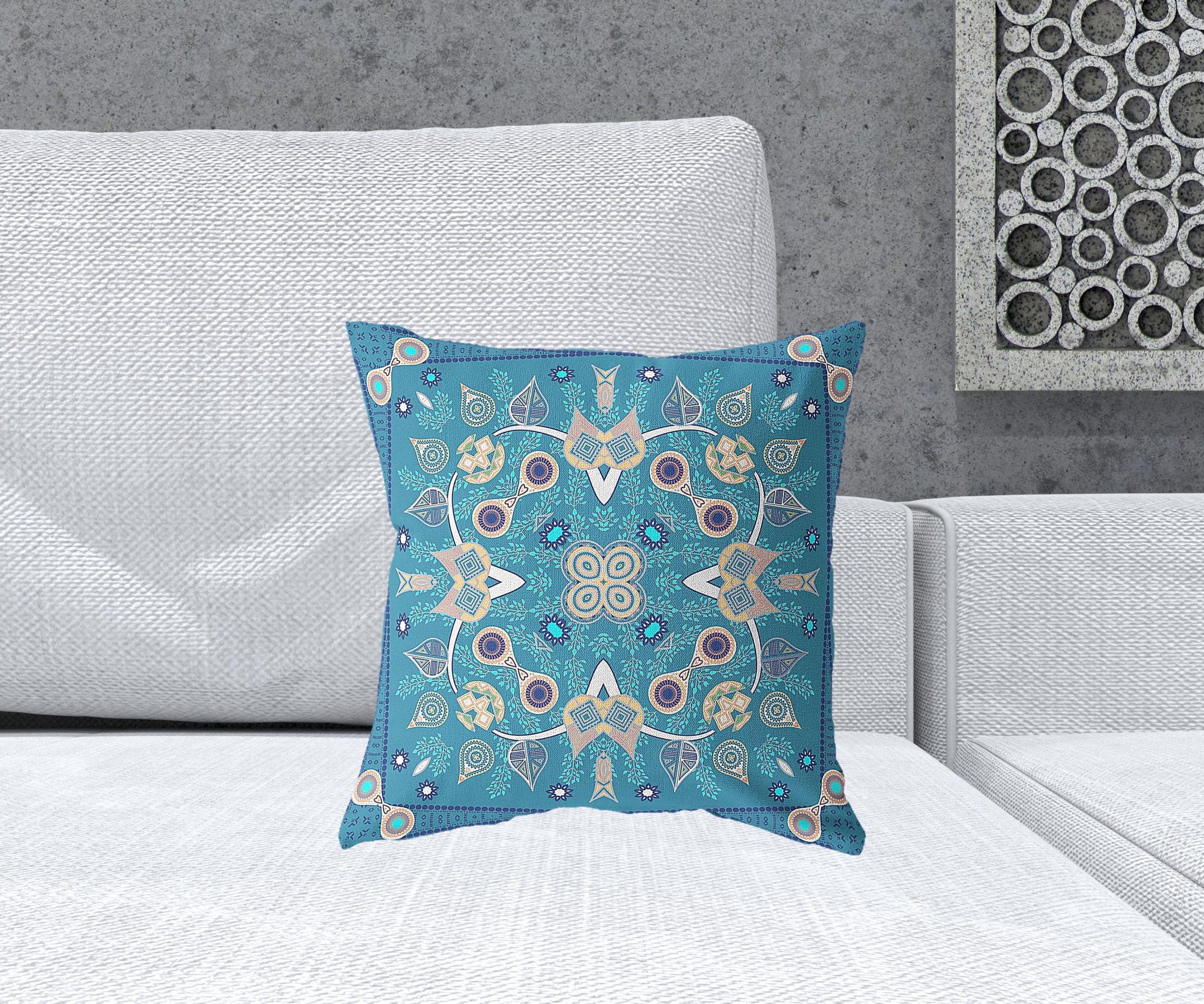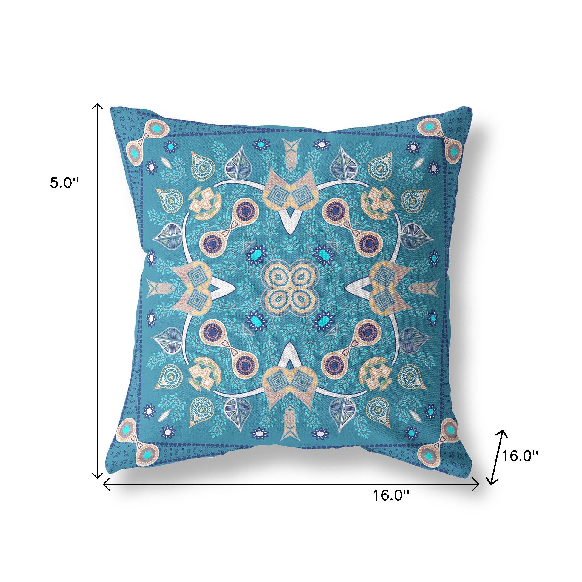 16" X 16" Blue And Beige Blown Seam Floral Indoor Outdoor Throw Pillow