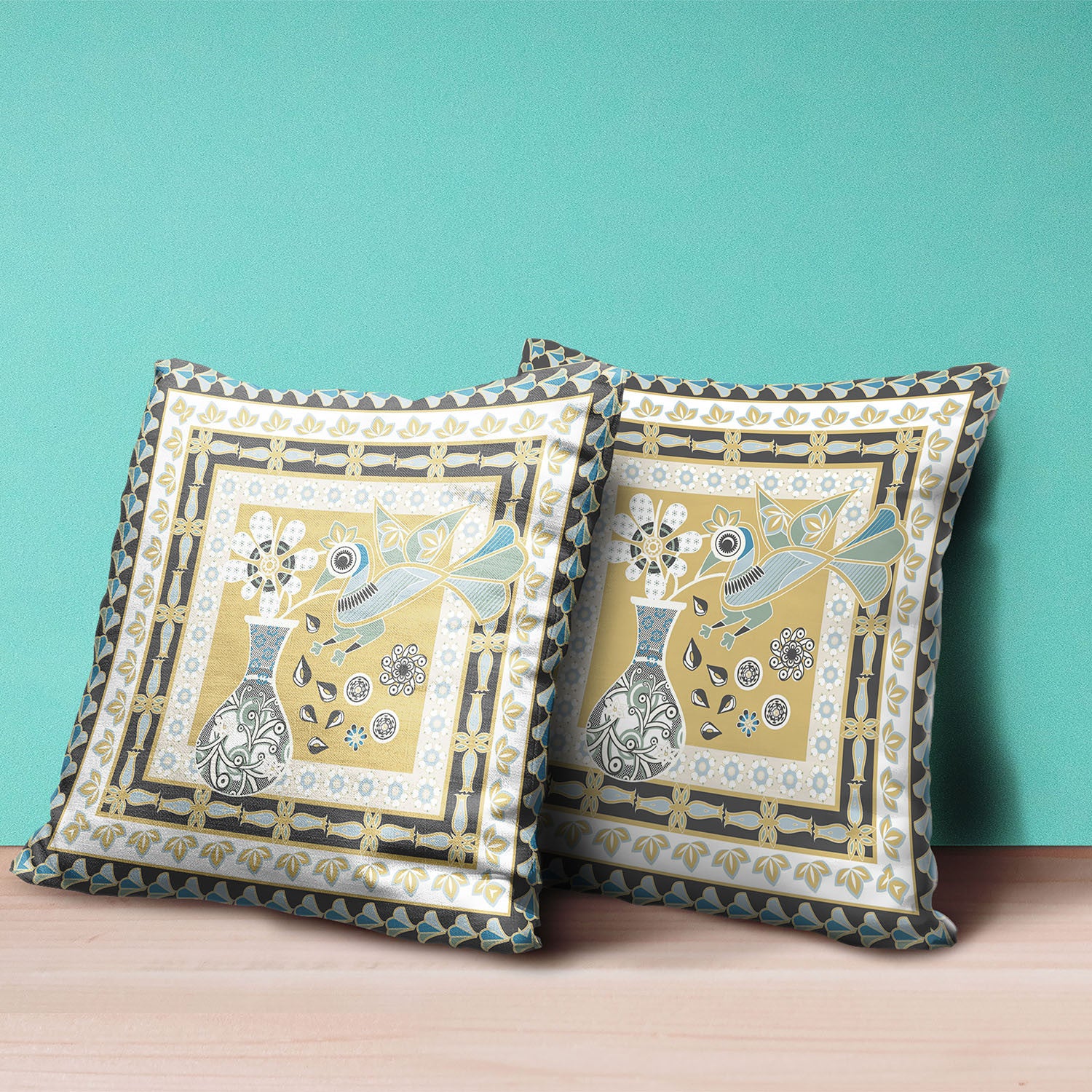 26" x 26" Beige and Black Peacock Blown Seam Floral Indoor Outdoor Throw Pillow