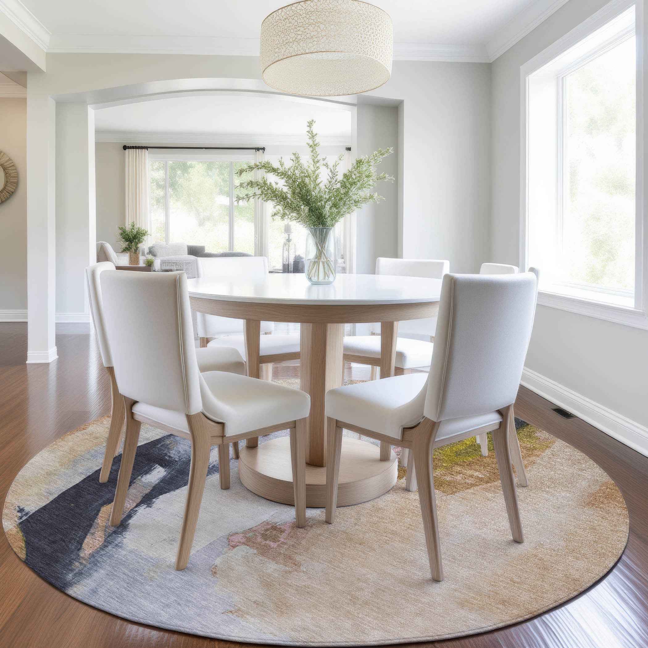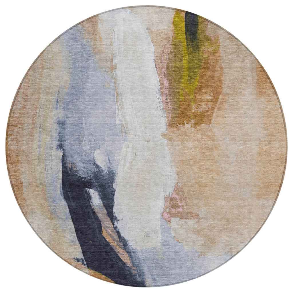 8' Beige And Navy Blue Round Abstract Washable Indoor Outdoor Area Rug