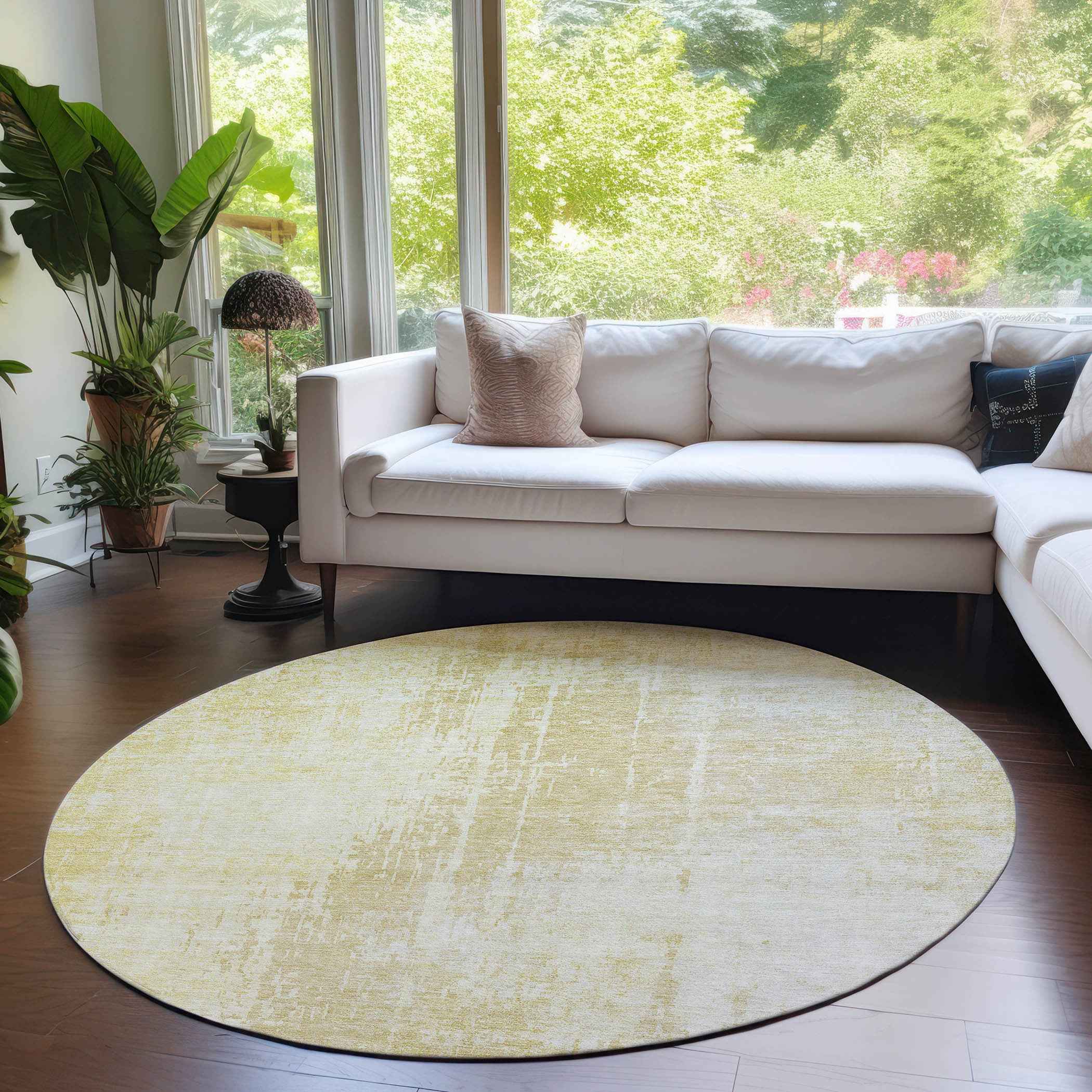 This 8-foot gold ivory and beige round abstract washable indoor outdoor area rug, is a great way to add warmth to a room. This geometric round shaped rug features a abstract pattern in gold, ivory, and beige that combines a good looking print with a unique and updated shape. The mix of shape, color, and design gives this rug refreshing visual interest. Ideal for outdoor spaces or high traffic areas with kids and pets, this rug is made from heavy duty polyester that is stain resistant to help repel water, dirt, and stains. Makes a great way to dress up your patio, porch, or poolside, but also works well as a durable and easy to maintain option in the kitchen, family room, or mudroom. 96-inch h x 96-inch w x 0.19-inch d.