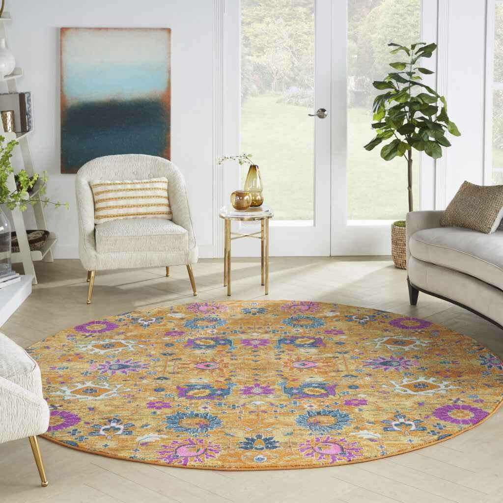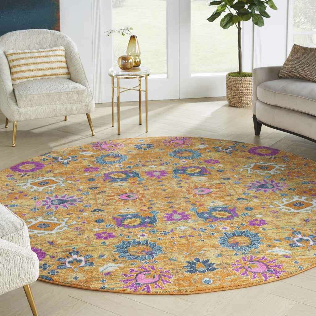 Add great coloration and comfortable texture to your space with this 8' gold round floral power loom area rug. This geometric round shaped rug features a floral pattern in gold that combines a good looking print with a unique and updated shape. The mix of shape, color, and design gives this rug refreshing visual interest. This superior Turkish rug represents the highest quality and is built to last. Place this area rug against a hardwood or tile floor and it will enliven your living space with style and sophistication. .50" H x 96.00" W x 96.00" D
