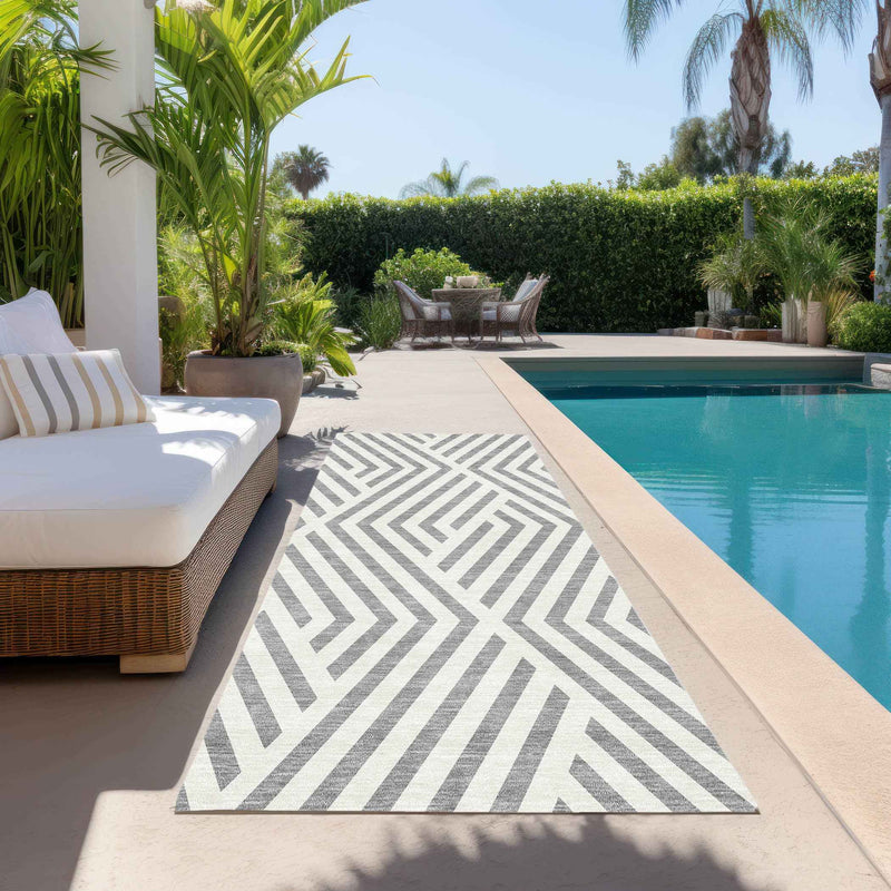 Add some artistry to your room with this 8-foot gray and ivory geometric washable indoor outdoor runner rug. This runner shaped rug features a geometric design that will work well both indoors or out. A classic shape marries with good looking design for your living room, hall, bedroom, porch, patio, or poolside. Ideal for outdoor spaces or high traffic areas with kids and pets, this rug is made from heavy duty polyester that is stain resistant to help repel water, dirt, and stains. Versatile in use, durable, and easy to maintain, this rug is an ideal solution to add a decorative and inviting touch to your indoor or outdoor space. 27-inch h x 90-inch w x 0.19-inch d.