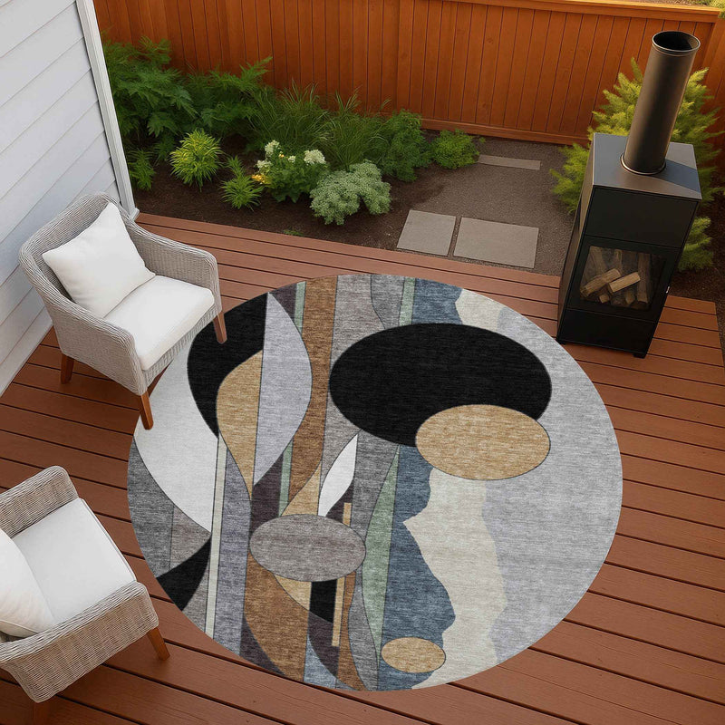 8' Gray Black And Gold Round Geometric Washable Indoor Outdoor Area Rug