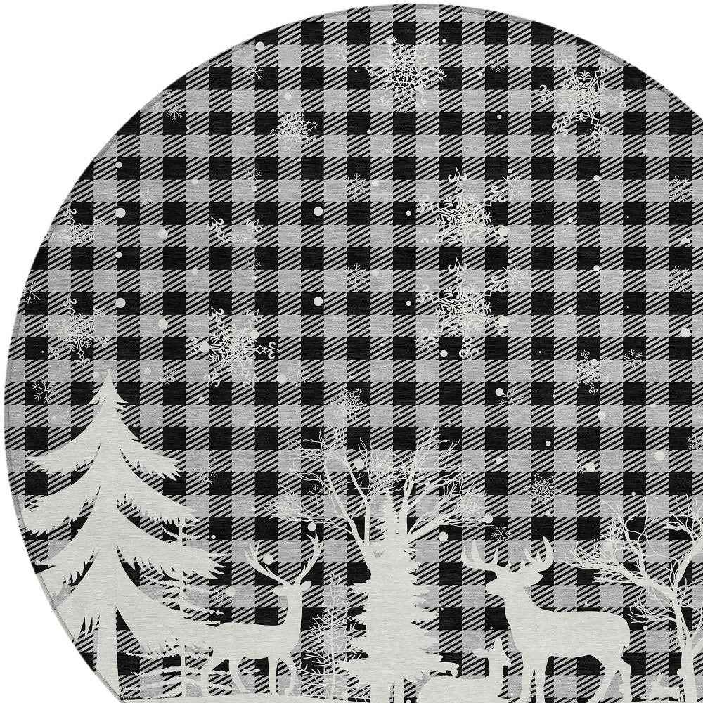 8' Gray Black And Ivory Round Plaid Washable Indoor Outdoor Area Rug