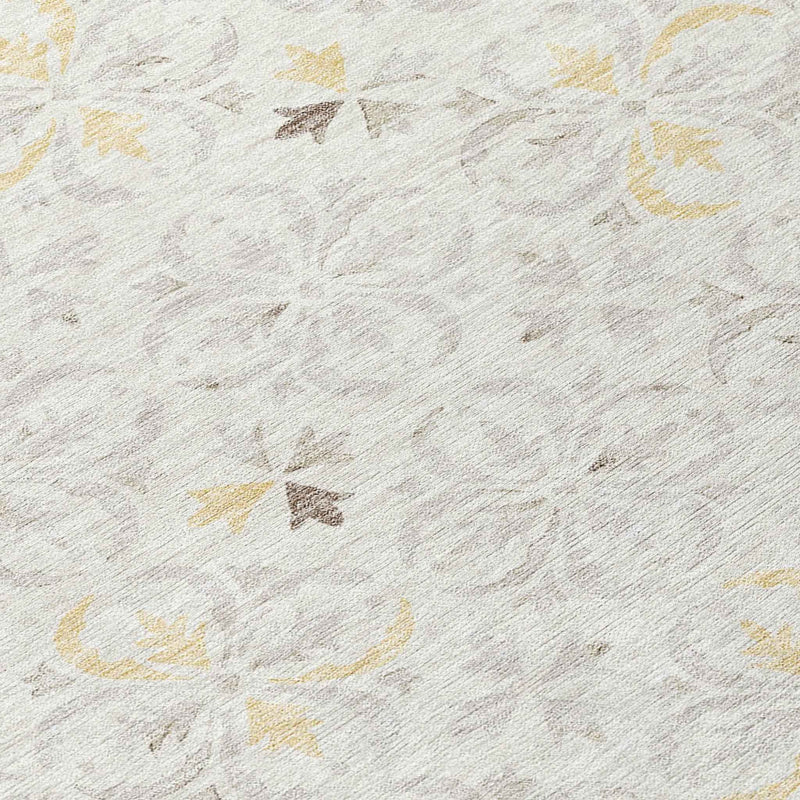 Add some artistry to your room with this 8-foot ivory gray and gold round floral washable indoor outdoor area rug. This geometric round shaped rug features a floral pattern in ivory, gray, and gold that combines a good looking print with a unique and updated shape. The mix of shape, color, and design gives this rug refreshing visual interest. Ideal for outdoor spaces or high traffic areas with kids and pets, this rug is made from heavy duty polyester that is stain resistant to help repel water, dirt, and stains. Makes a great way to dress up your patio, porch, or poolside, but also works well as a durable and easy to maintain option in the kitchen, family room, or mudroom. 96-inch h x 96-inch w x 0.19-inch d.