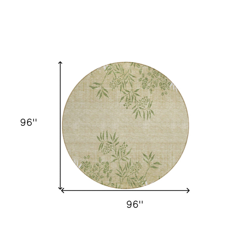 8' Khaki Ivory And Green Round Floral Washable Indoor Outdoor Area Rug