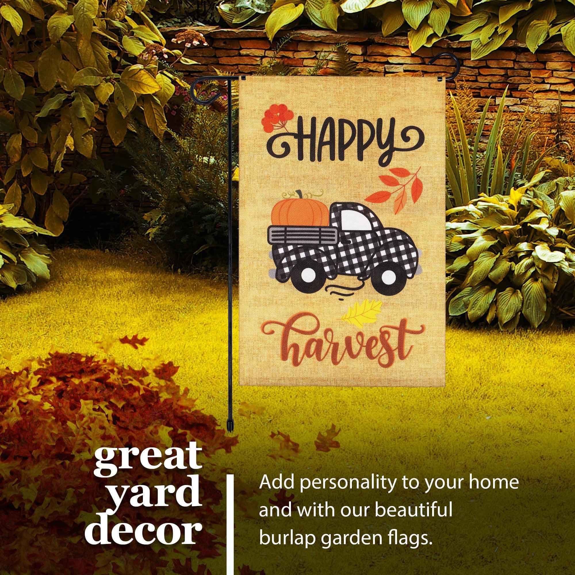 G128 Combo Pack: Garden Flag Stand Black 36 in x 16 in & Garden Flag Fall Decoration Happy Harvest Pumpkin in Truck Bed 12"x18" Double-Sided Burlap Fabric