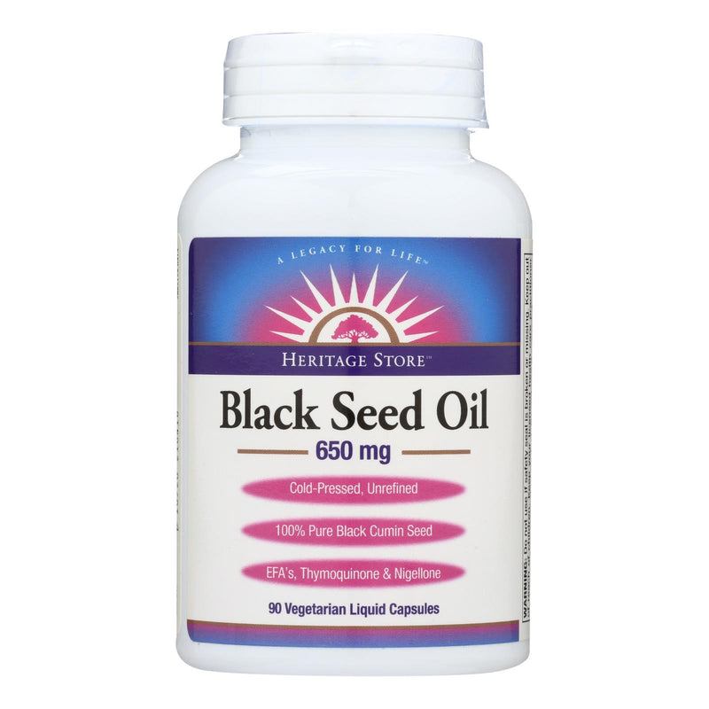 Heritage store black seed oil dietary supplement helps you achieve a healthier lifestyle. Take two capsules with food up to twice daily, and supply your body with antioxidants and essential fatty acids. Packaged in a 90-count bottle, each 650 mg. Vegetarian liquid capsule contains unrefined cold-pressed oil that underwent minimal processing to preserve most of its nutrients. Good for the immune system, this supplement also has phyto-nourishing properties that help soothe and cleanse the gut.