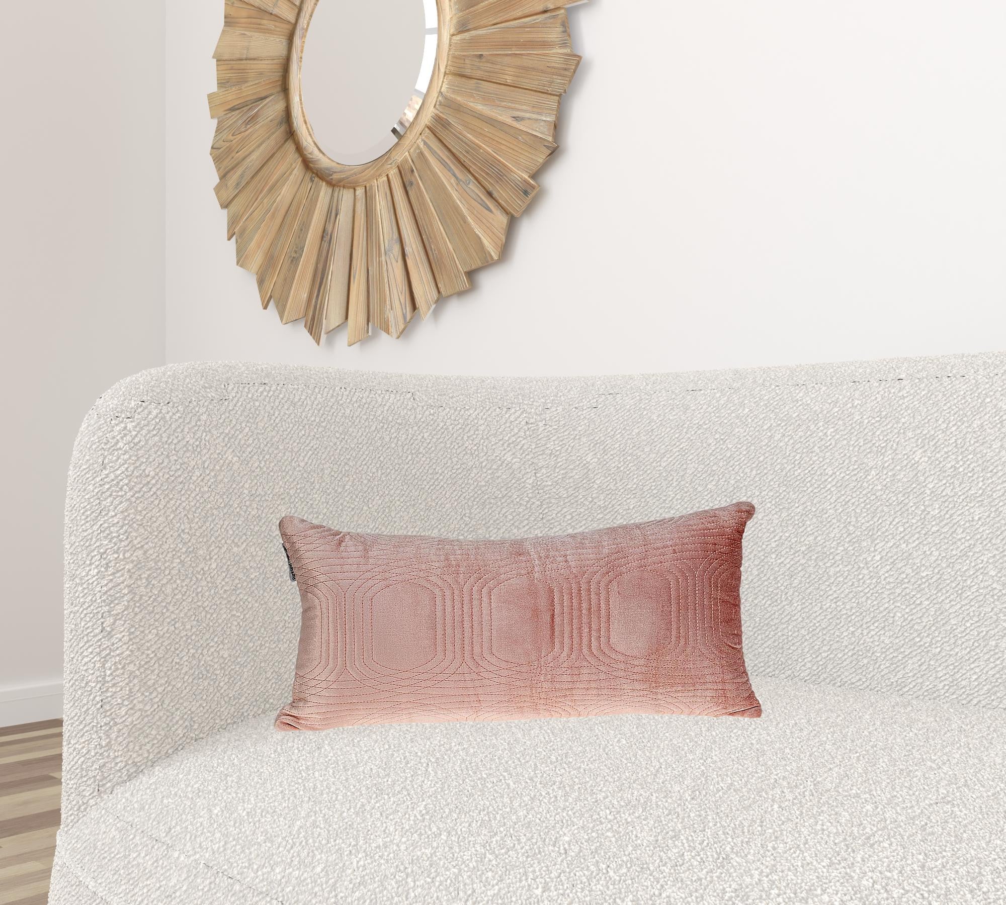 Spruce up your home with the Quilted Velvet Pink Lumbar Throw Pillow, premium in design the pillow is an excellent mode to portray a soft ambience into your busy space. Featuring a combination of cotton and velvet, the lumbar throw pillow comprises of seamless geometric patterns that enhances it's unique texture making it super comfy and cozy. A concealed zipper on the back makes it easy for cleaning and reinserting. Attractive and sophisticated this throw pillow is perfect for your bed, sofa or accent chair, ideally a piece that completes your home. 12" x 24" x 4"