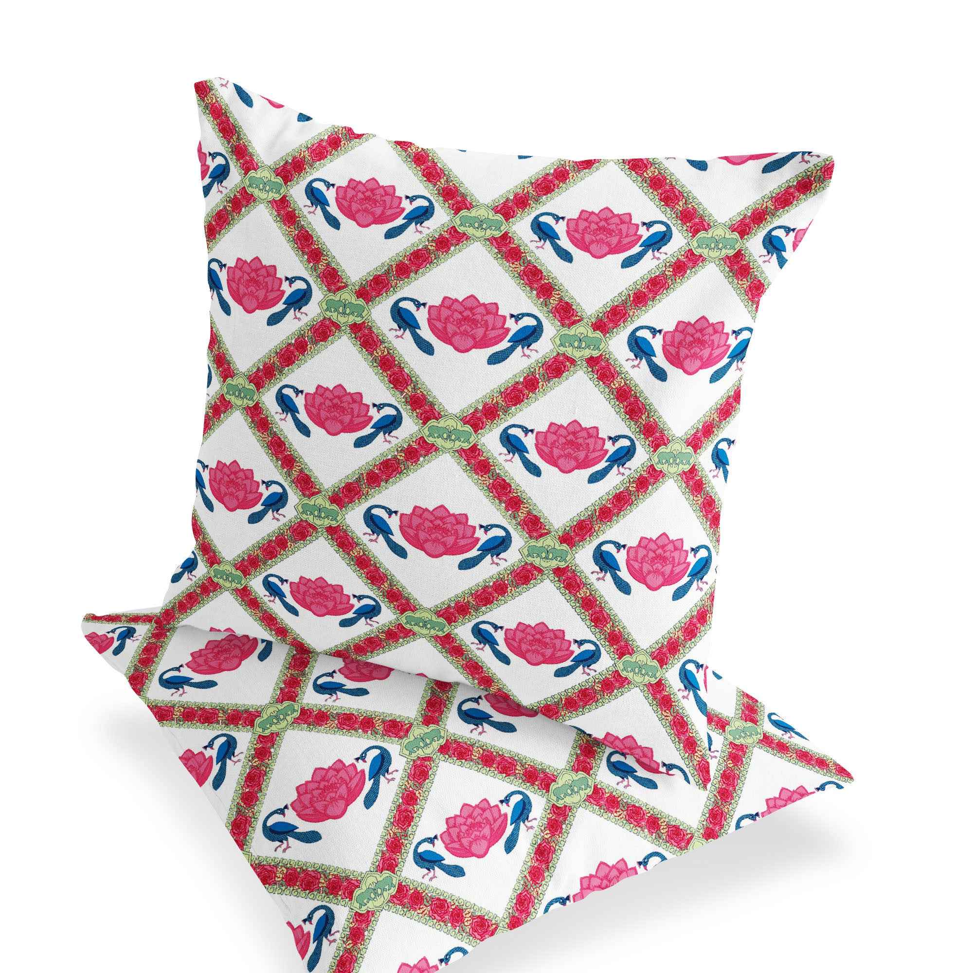 Set of Two 16" X 16" Pink and White Peacock Blown Seam Floral Indoor Outdoor Throw Pillow