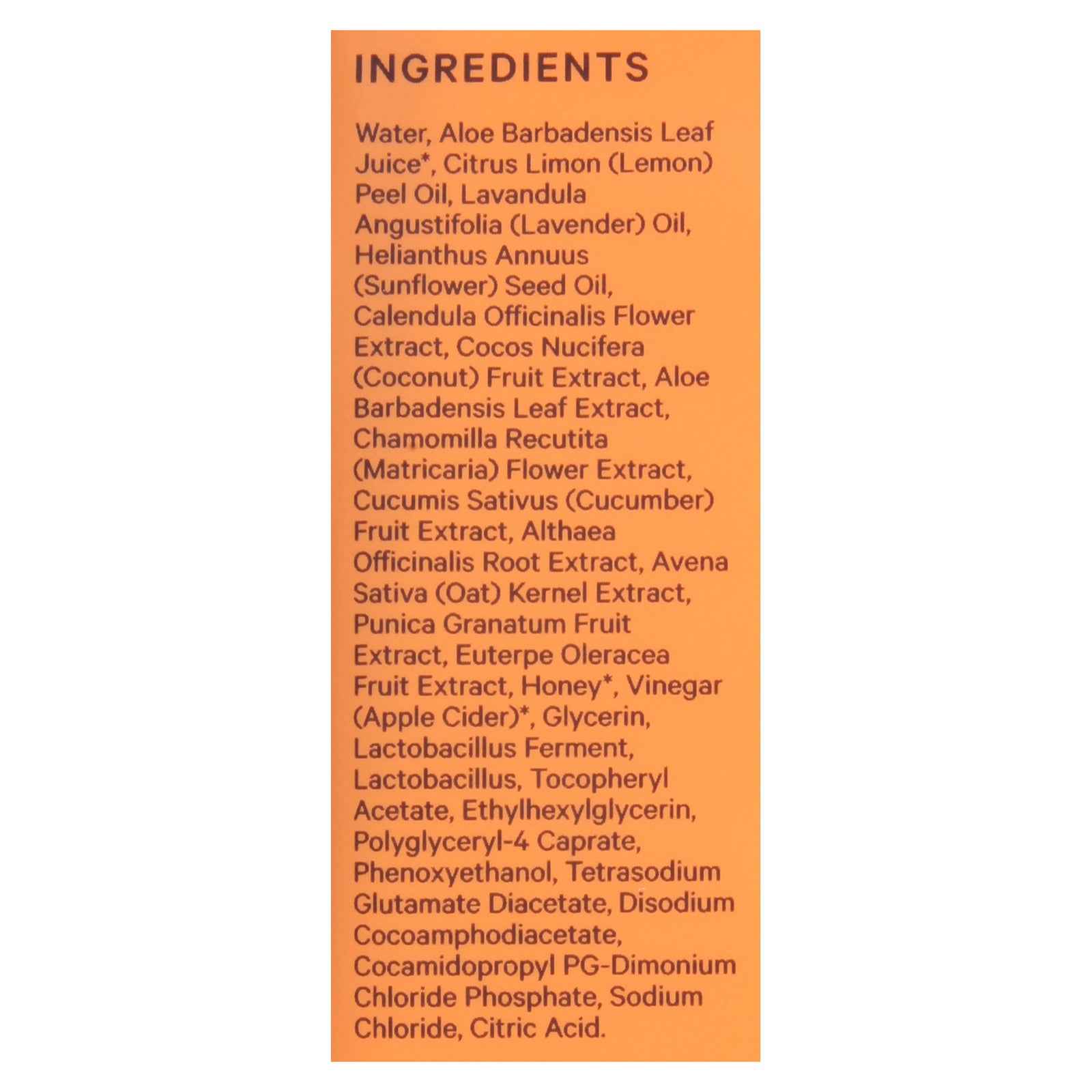 ingredients : water;aloe barbadensis leaf juice;citrus limon (lemon) peel oil;lavandula angustifolia (lavender) oil;helianthus annuus (sunflower) seed oil;calendula officinalis flower extract;cocos nucifera (coconut) fruit extract;aloe barbadensis leaf extract;chamomilla recutita (matricaria) flower extract;cucumis sativus (cucumber) fruit extract;althaea officinalis root extract;avena sativa (oat) kernel extract;punica granatum fruit extract;euterpe oleracea fruit extract;honey;vinegar (apple cider);glycerin