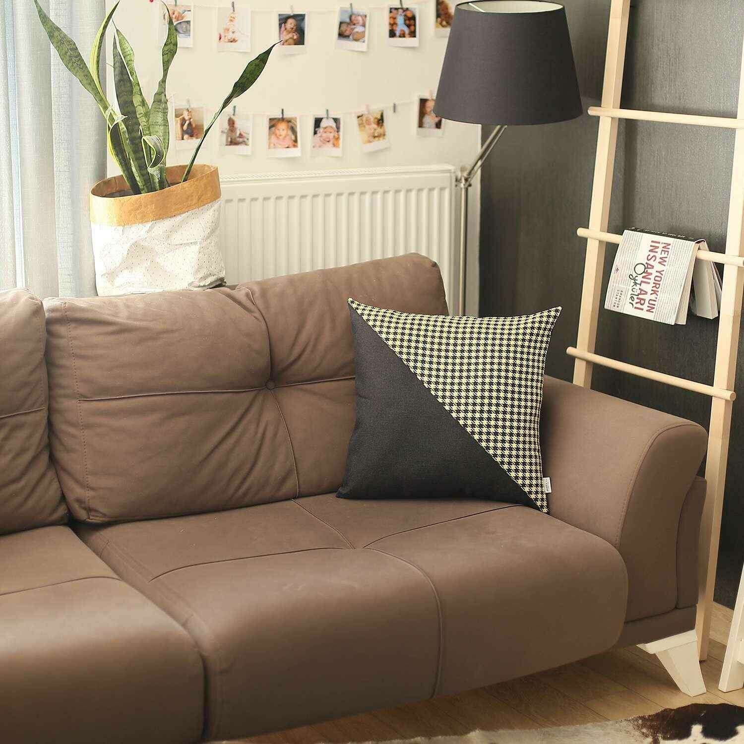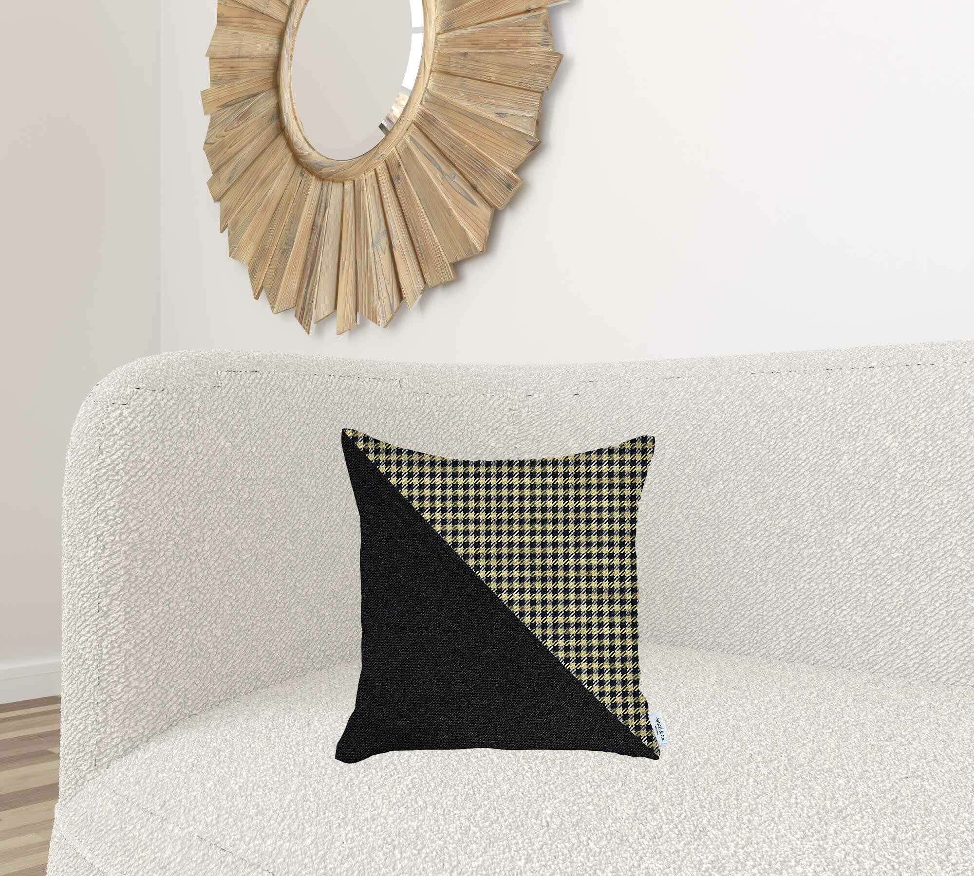Embracing the sophistication of modern styling, this Yellow Houndstooth Modern Decorative Throw Pillow will tie together the aesthetics of your living space with a stylish impression. Made in Turkey with durable polyester fabric which is OEKO-TEX Standard 100 certified to ensure product safety and optimum quality. The fabric should only be spot cleaned to keep its pristine look for years to come. Featuring the houndstooth checkered pattern in yellow and black diagonally separated from the solid charcoal black end to create visual intrigue. Made to feel soft and seamless on the touch, the hidden zipper closure all around does the trick while the soft poly insert contributes to the fluffy look and cozy feel. Place this stylish throw pillow on the sofa, couch, or sitting area and it will add a modern-classic vibe to the room. 18” x 18” x 1”