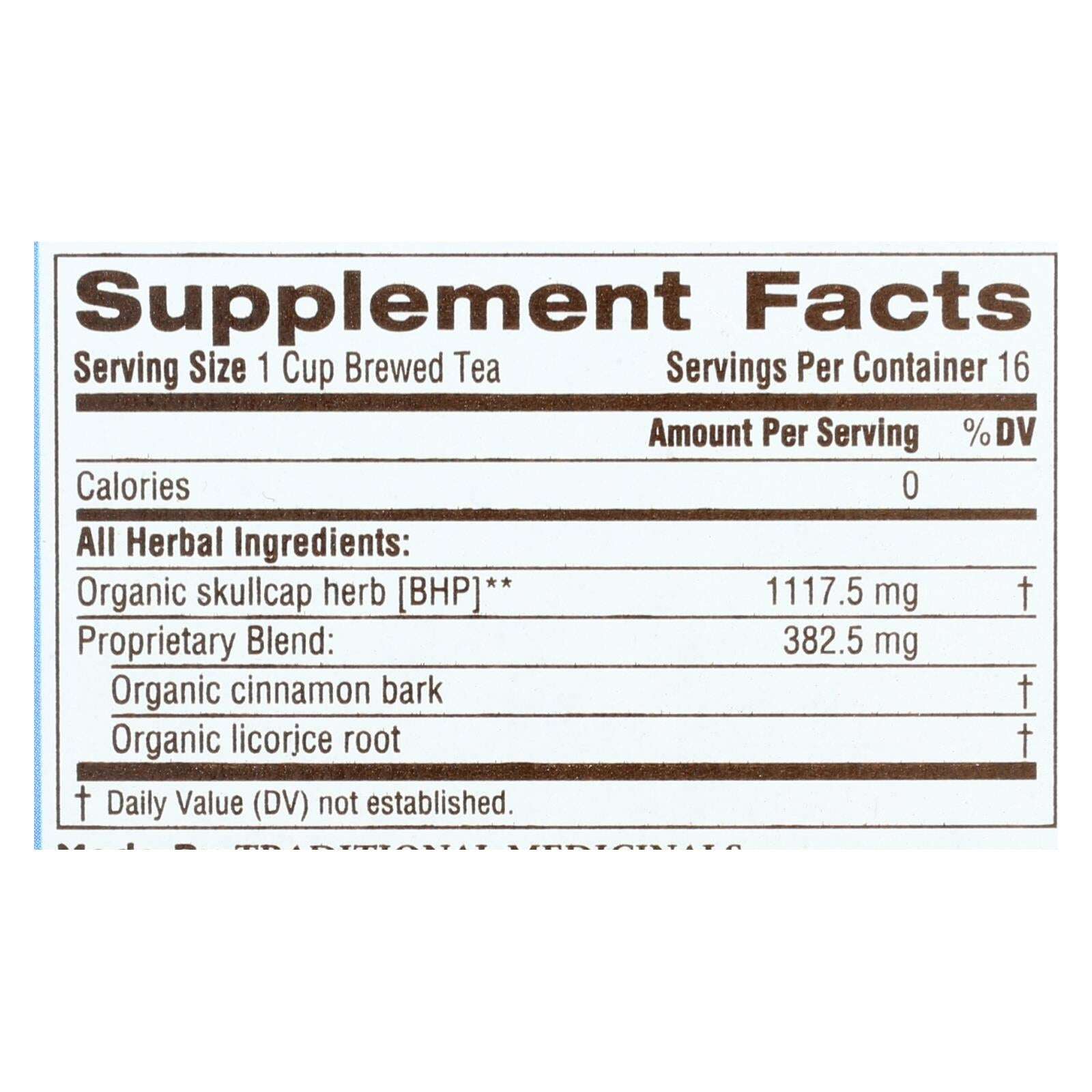 Traditional medicinals' stress ease cinnamon bagged tea is made with certified usda organic and verified non-gmo ingredients. Each box contains 16 tea bags of our naturally caffeine free herbal tea. The primary ingredient, organic skullcap herb, gives our tea it's ability to help bring the body back to balance during stressful times. See label for warnings and risks.