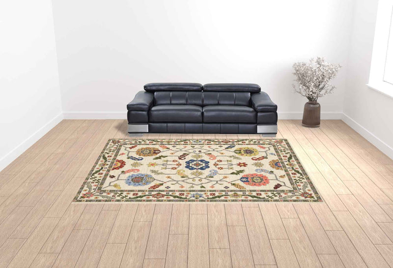 10' X 13' Ivory Green Blues Pink Yellow Rust Brown Tan And Grey Oriental Power Loom Stain Resistant Area Rug With Fringe