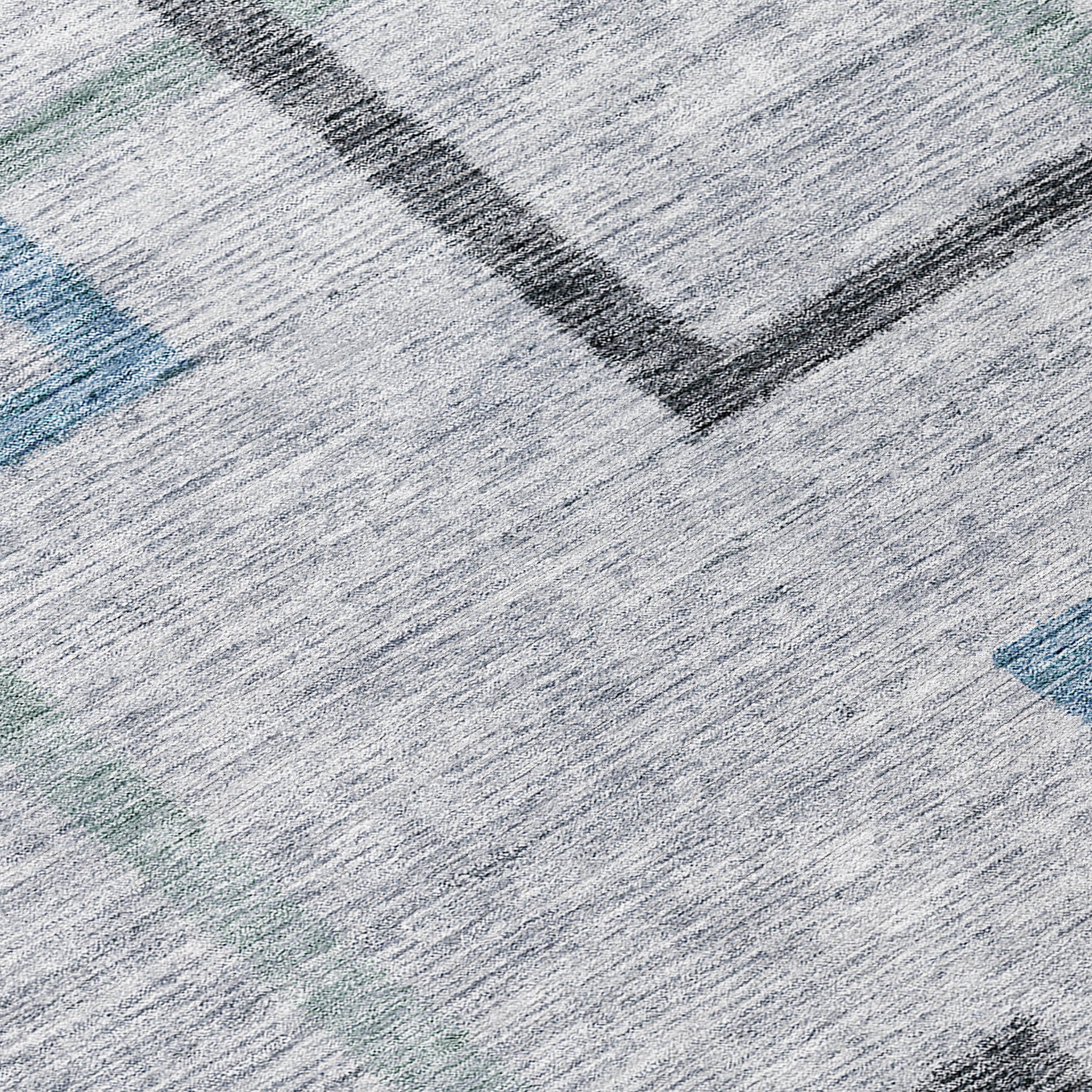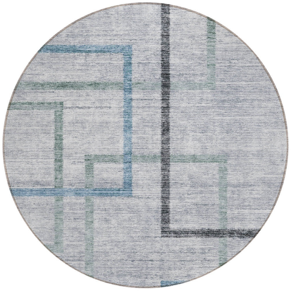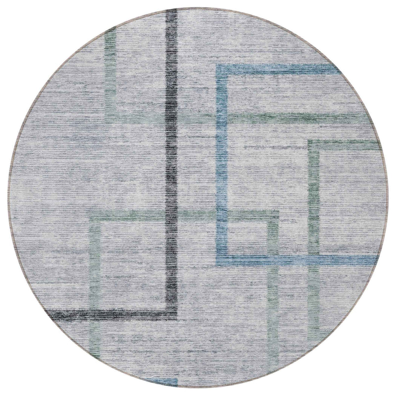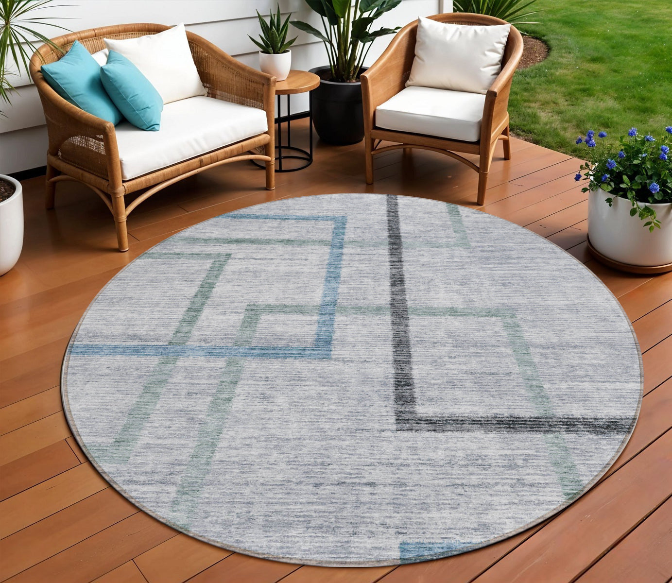 8' Gray Charcoal And Blue Round Geometric Washable Indoor Outdoor Area Rug