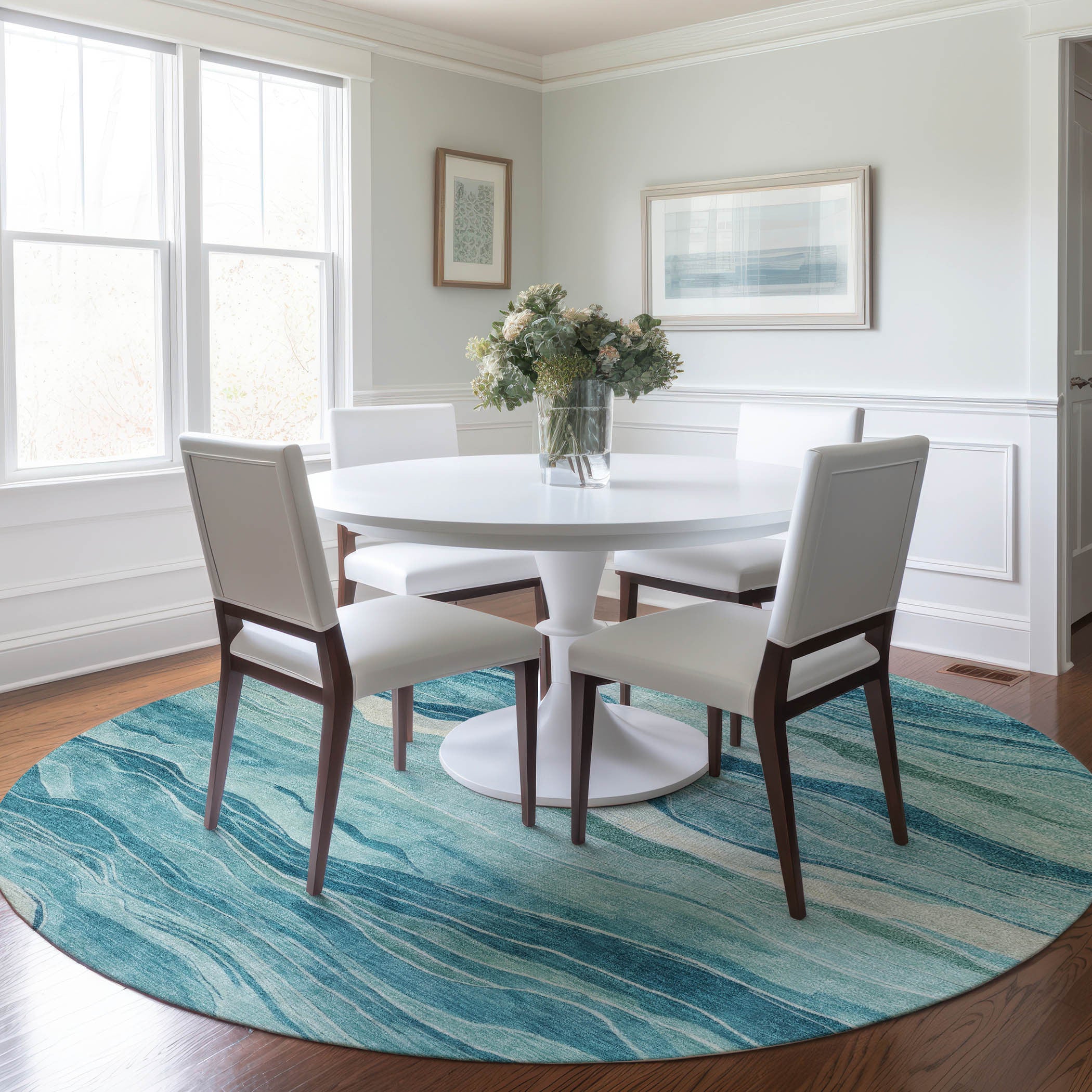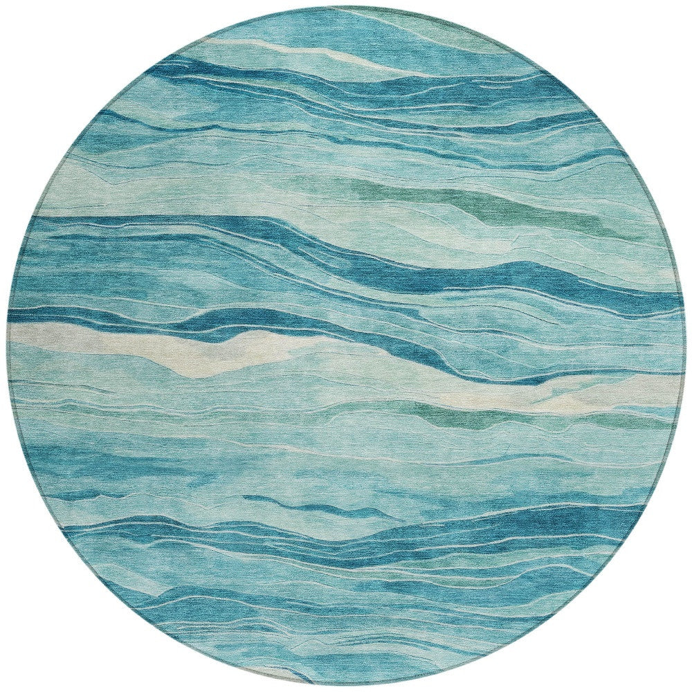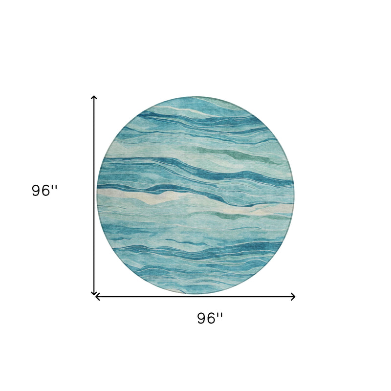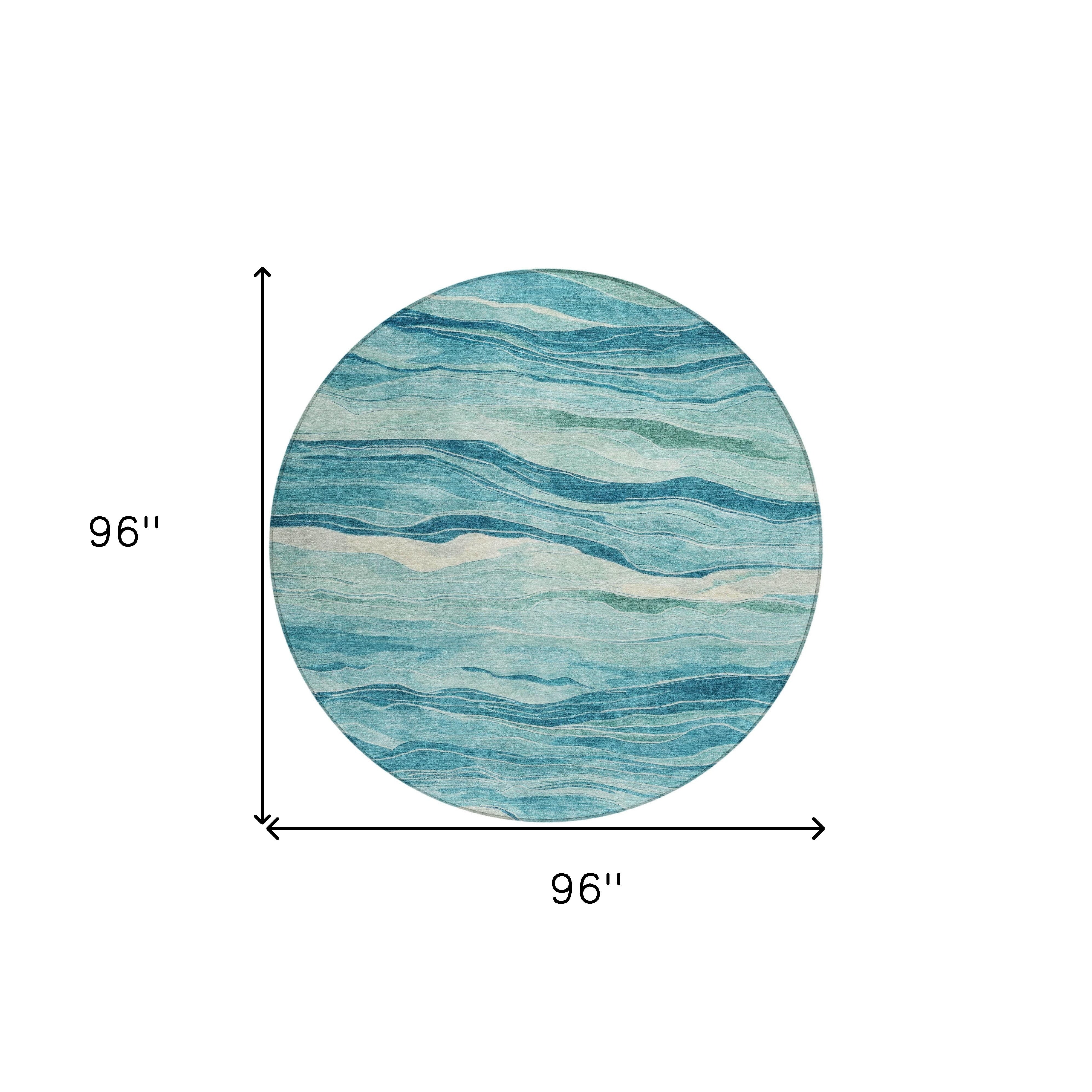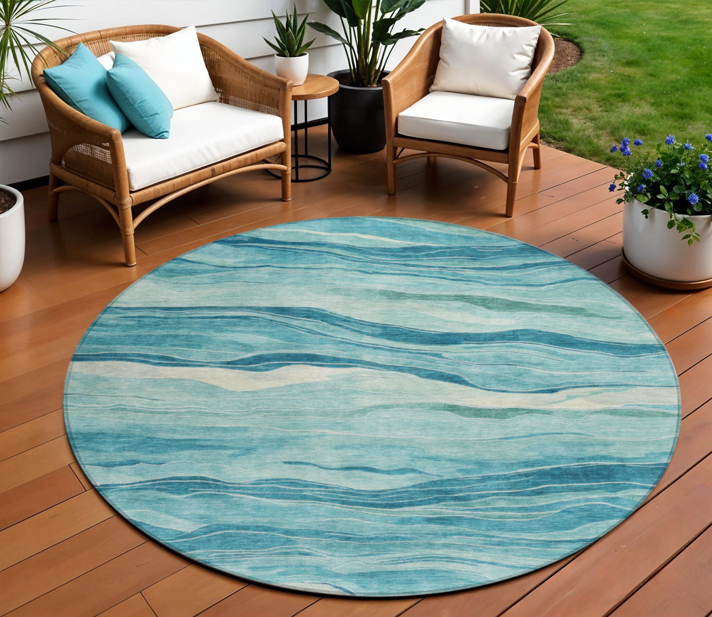 8' Turquoise Round Striped Washable Indoor Outdoor Area Rug