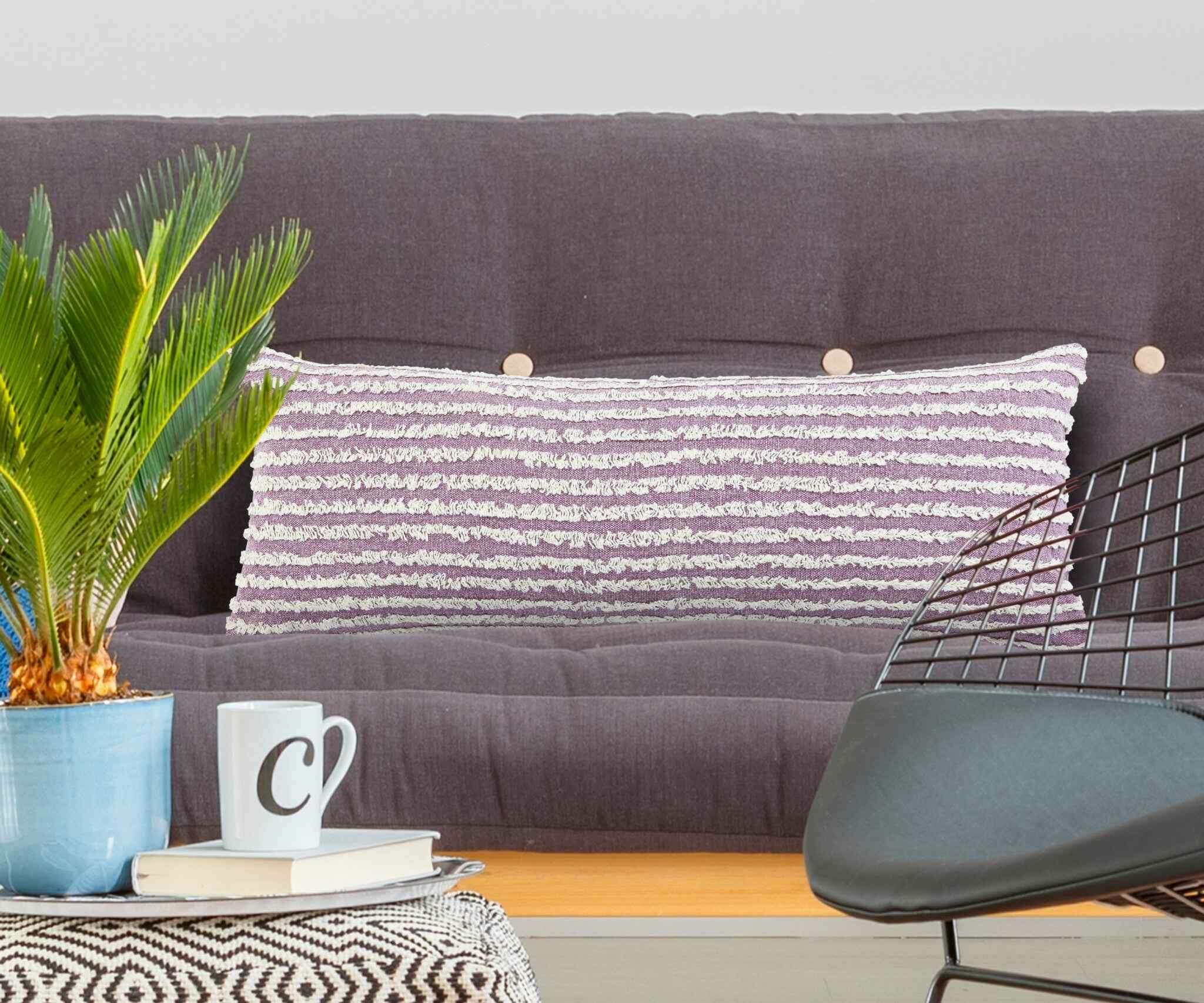 14" X 36" Purple And Cream 100% Cotton Striped Zippered Pillow