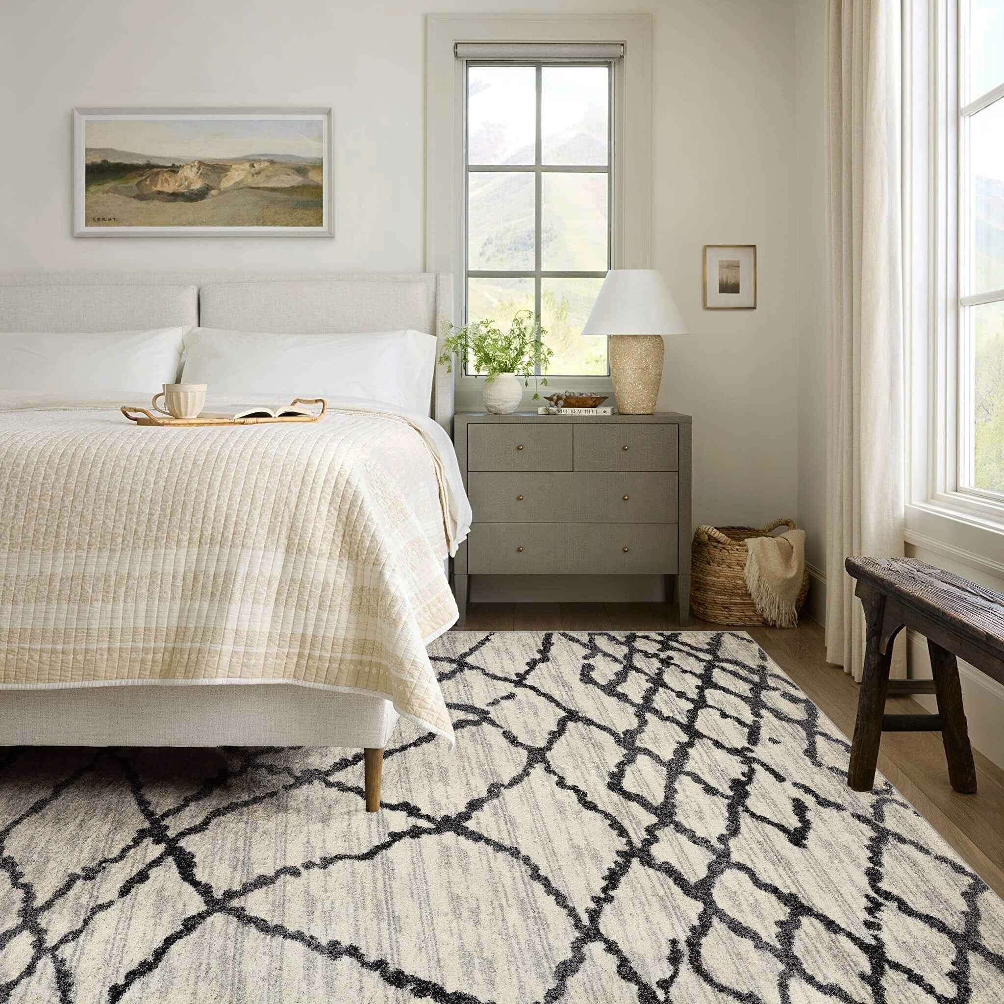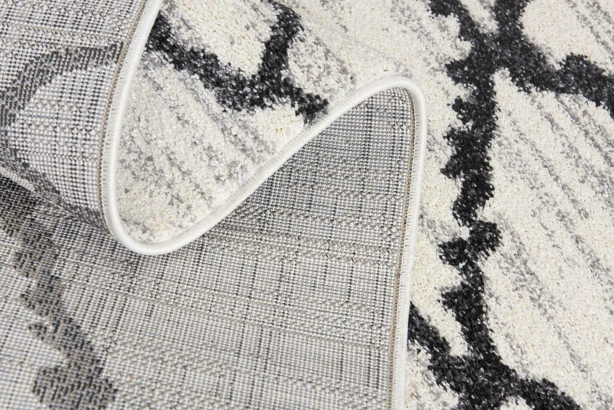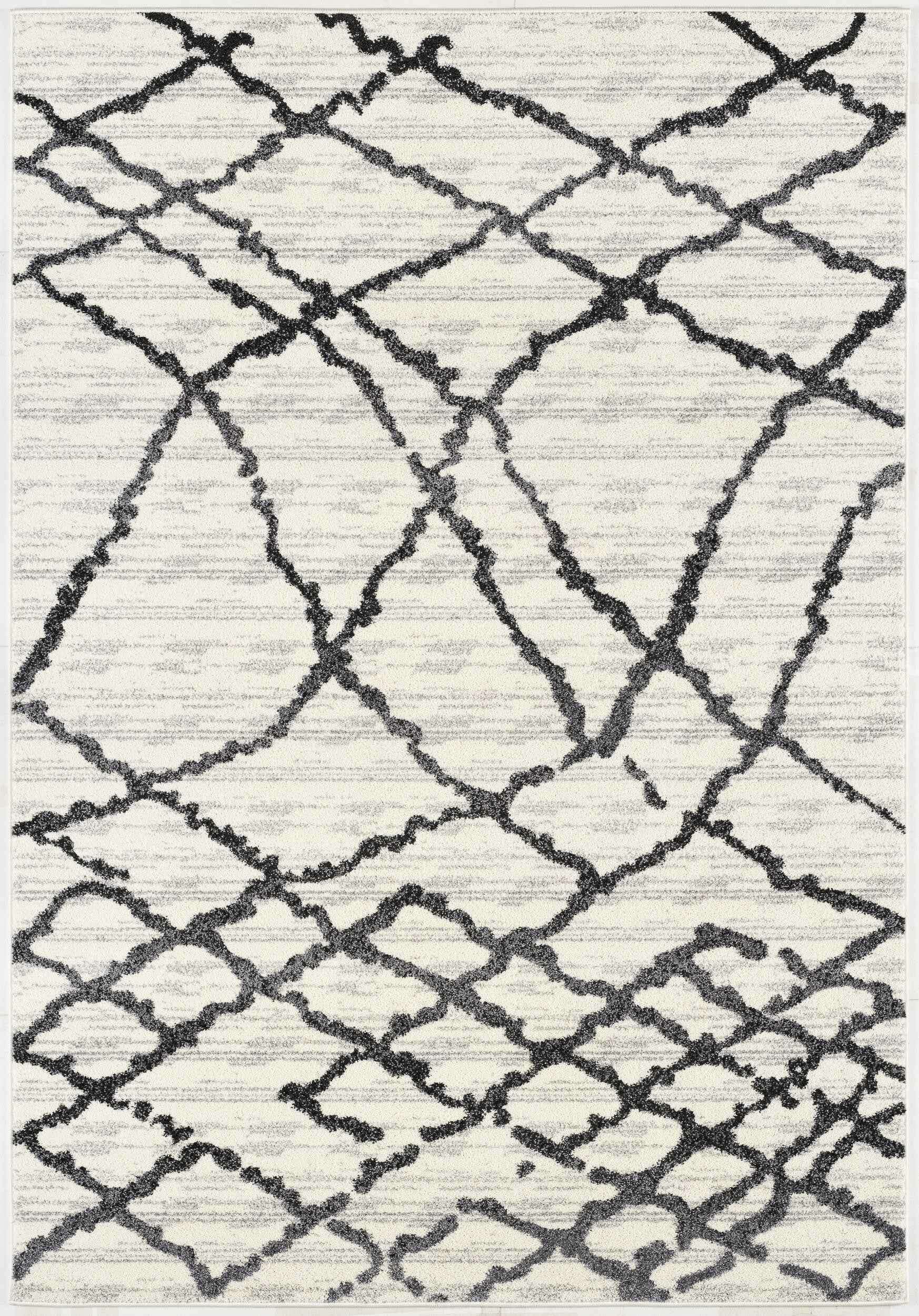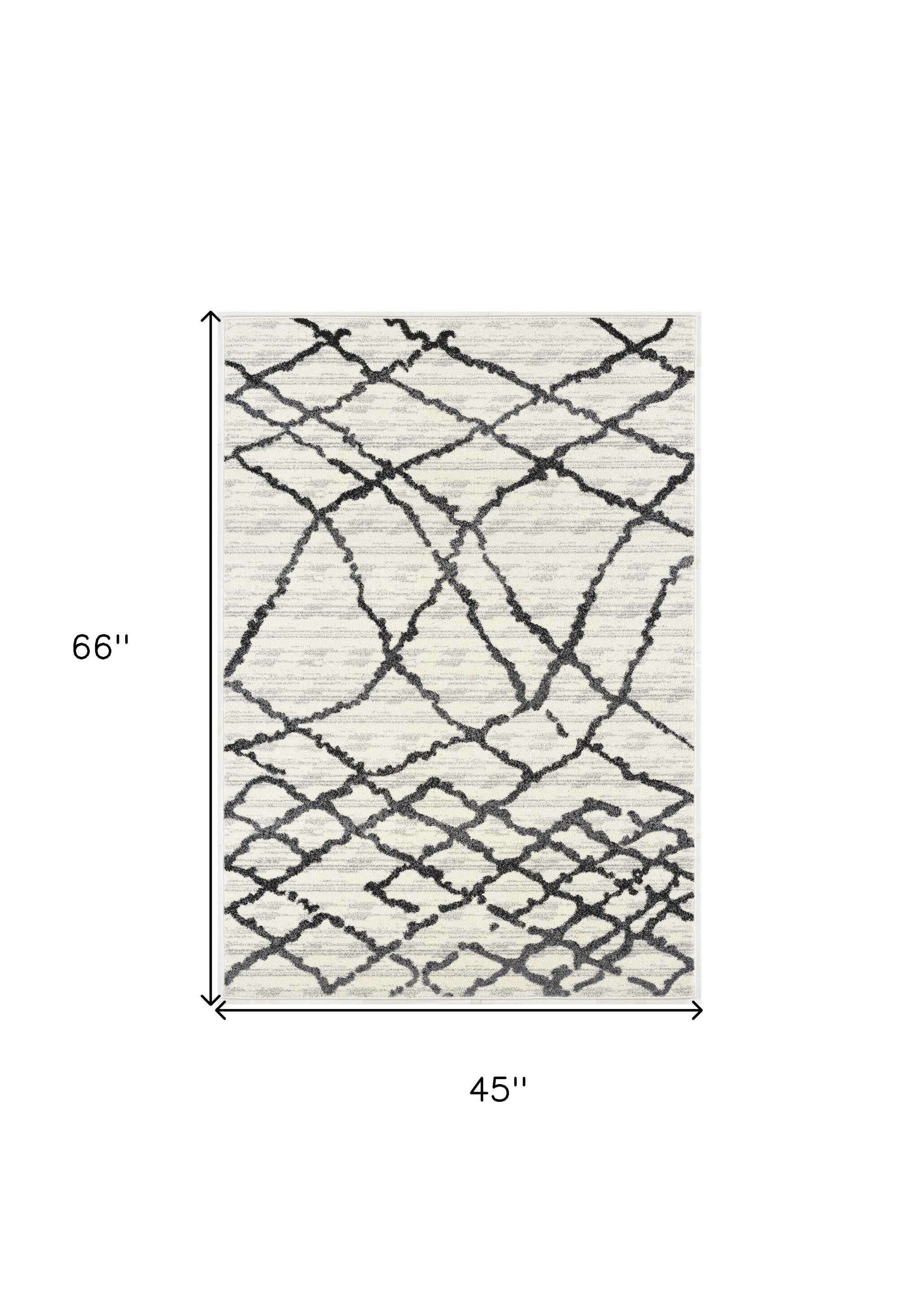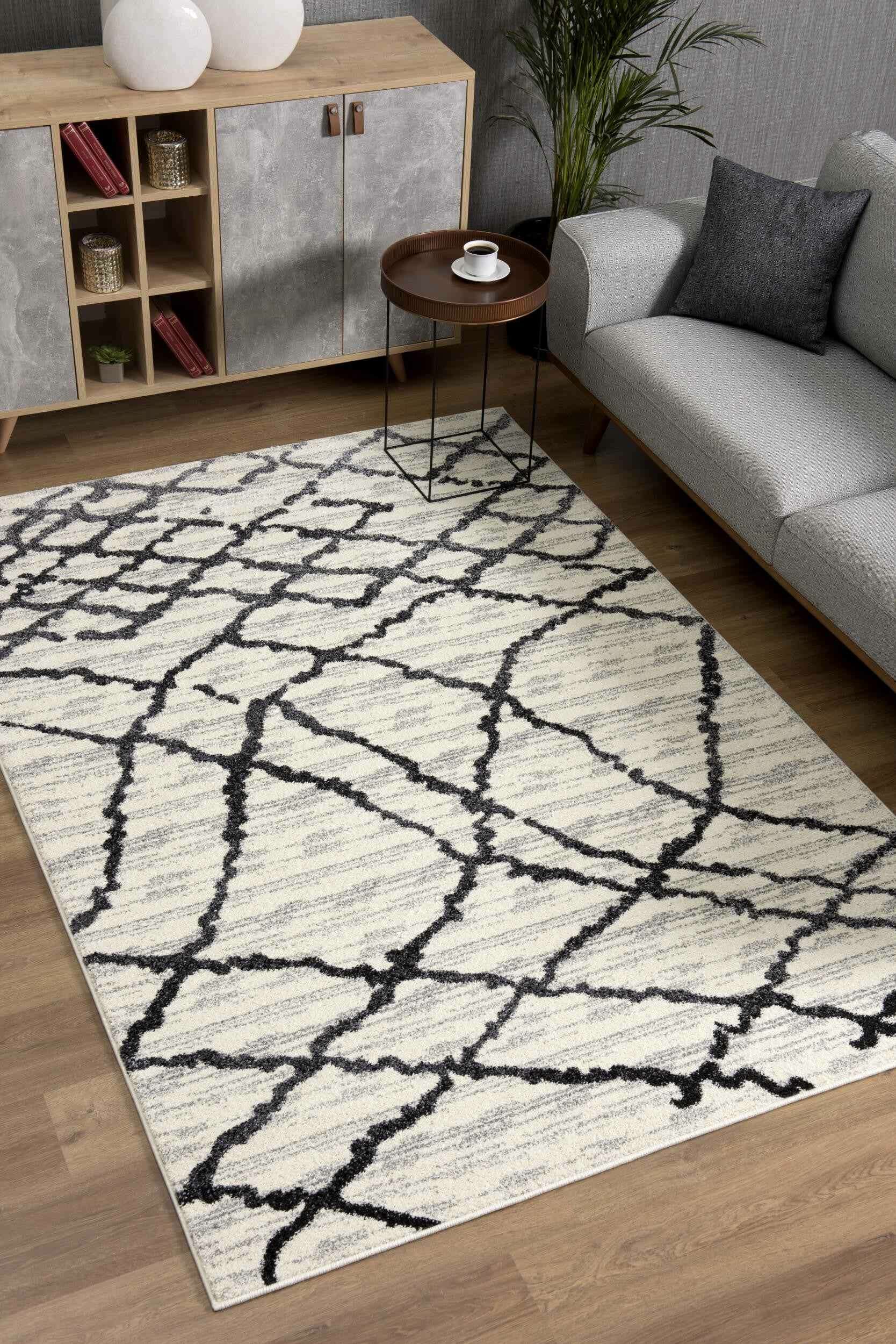 Engaging in the sophistication of Contemporary styling, this Gray and Black Modern Abstract Area Rug exhibits a classic color palette to create a compelling look in any modern living space. The distorted black strings in an abstract net-like fashion add to a visual contrast over the distressed grayish-white backdrop. Crafted with care by Turkish artisans, this rug is made of 100% twisted polypropylene to resist almost all types of spillage and stains while ensuring easy cleaning and enhanced durability to withstand heavy foot traffic. The high looped pile construction not only adds to the surface interest but also offers a layer of warmth and comfort under the feet for a cozy atmosphere in your bedroom, dining space, living room, or hallway. Made to stand out on any neutral or dark-toned floor, this monochromatic area rug will tie together the aesthetics of your modern decor. 66” x 45” x 0.8”