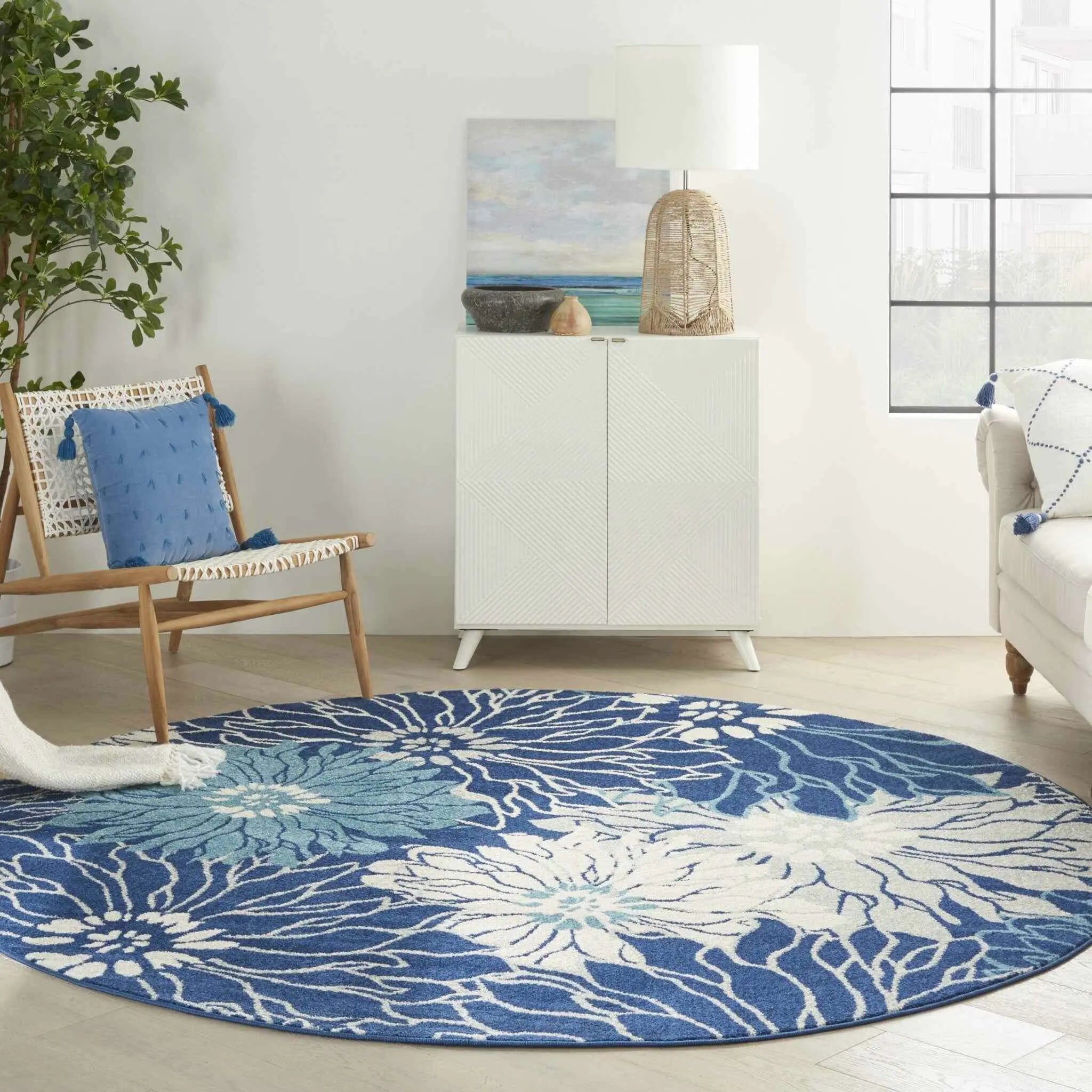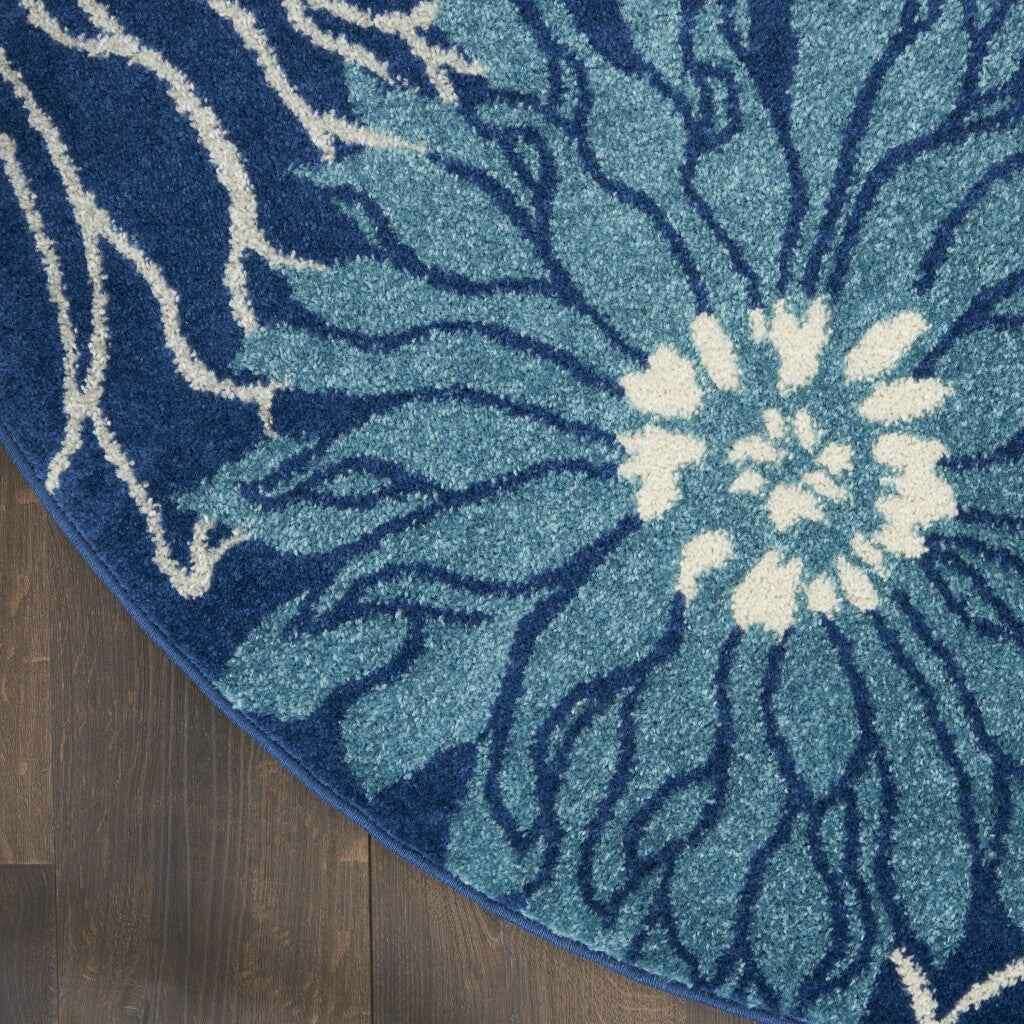 8' Blue And Ivory Round Floral Dhurrie Area Rug