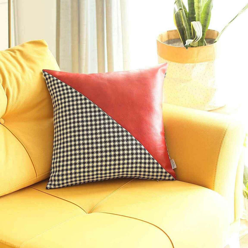The fusion of modern luxury and bohemian interest flaunting in this Houndstooth Red Faux Leather Throw Pillow will stand upfront in any contemporary or countryside setting. Boasting an exquisite diagonal split design with a houndstooth checkered pattern on one end and a vibrant red leather finish on the other for a visual appeal. Handcrafted by Turkish artisans with polyester and 100% vegan faux leather that speaks of its durability, while a Standard 100 certification by OEKO-TEX ensures superior product quality and safety. With a hidden zipper finish all around and a soft poly filling inside, the pillow feels super cozy and seamless on the touch. Accentuating style and warmth in its tasteful design and palette, this decotative throw pillow will be a great addition to your living room, bedroom, or sitting area. 18” x 18” x 1”