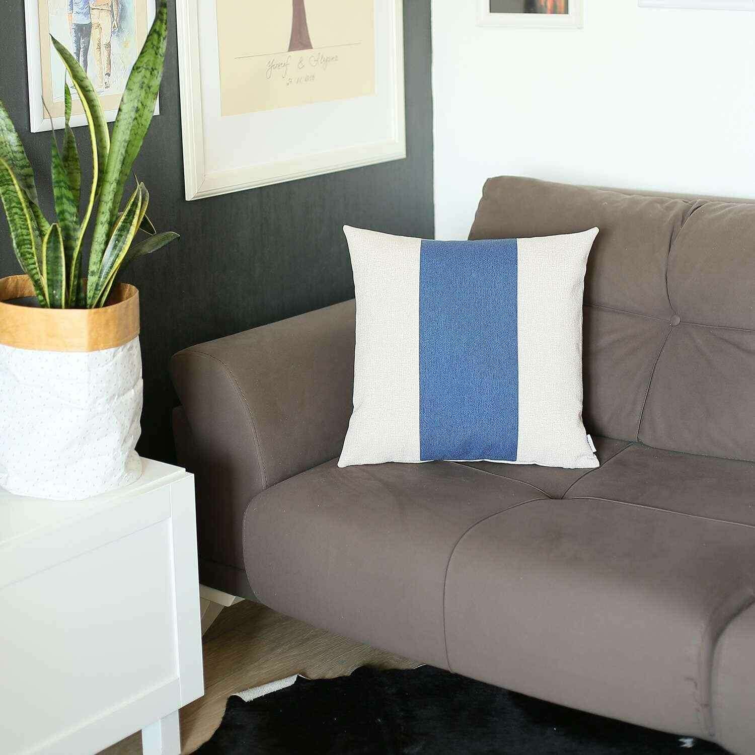 Add depth and timeless elegance to your modern living space with this White and Blue Centered Strap Throw Pillow. The icy white base looks calming with that slate blue midsection to accentuate a refreshing tone in the room. Handmade in Turkey with 100% polyester fabric which is OEKO-TEX Standard 100 certified to make sure highest product safety and long-lasting durability. This pillow should only be spot cleaned to remove stains and keep its sheen for long. The all-around zipper closure provides a seamless finish that feels super smooth and unified on the touch. You will experience a cozy feel every time you hold this pillow as it is filled with a high-quality soft poly filling inside. Transform your living room with this modern throw pillow that will grab the attention of the guests as soon as they step into your home. 18” x 18” x 1”