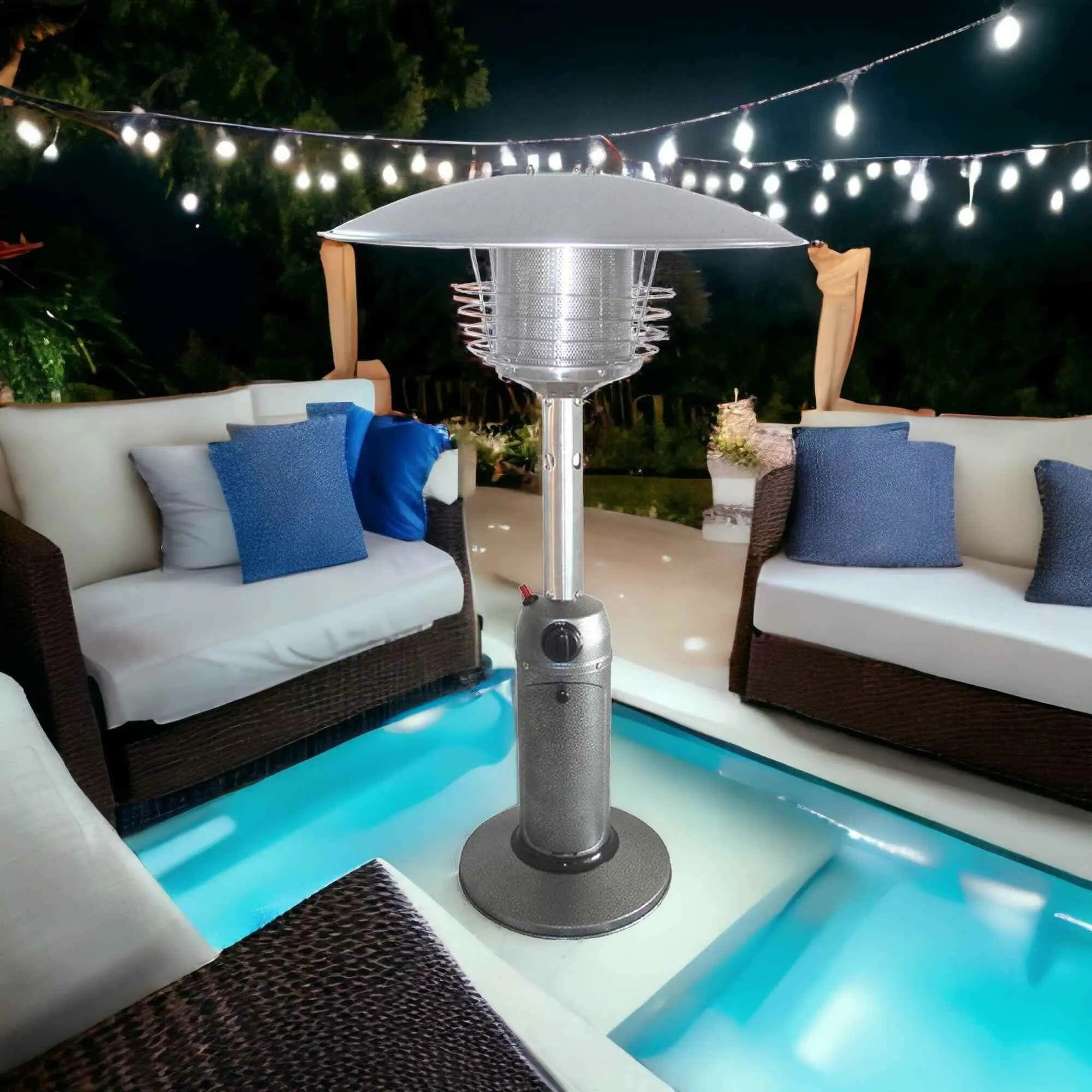 Not only does this 11000 btu silver steel propane cylindrical pole tabletop patio heater provide warmth and comfort, but it is also sleek and stylish. Conveniently uses a propane tank that can easily be switched out to provide quick and toasty heat to your outdoor space. Thanks to the automatic safety shutoff feature, you can keep your outdoor areas warm with no fear of overheating or forgetting to turn off. You can install this heater under a covered patio and rest assured that it will provide safe warmth. This unit not only provides warmth but is easily portable, making it a great option to take travelling. An adjustable seating allows you to emit just the right amount of heat for your situation. The outdoors can be cold, but with this heater you will always feel cozy and toasty. 38-inch H x 20.9-inch W x 20.9-inch D