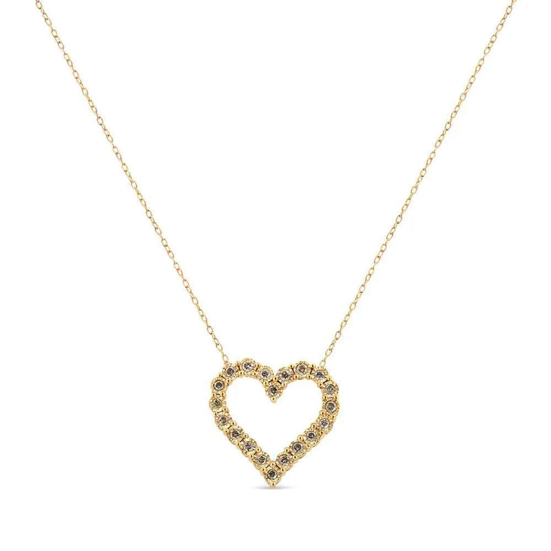 Lovely and elegant, this 10kt yellow gold plated 925 sterling silver heart pendant is embellished with 20 sparkling, champagne color diamonds. The diamonds are round-cut and have a total carat weight of 1/2 c.t. Set in a miracle plate setting, the diamonds shine against against the yellow gold. This piece comes with an 18" inch rope chain that will hang beautifully off of your neck. You will love the addition of this necklace to your jewelry collection.