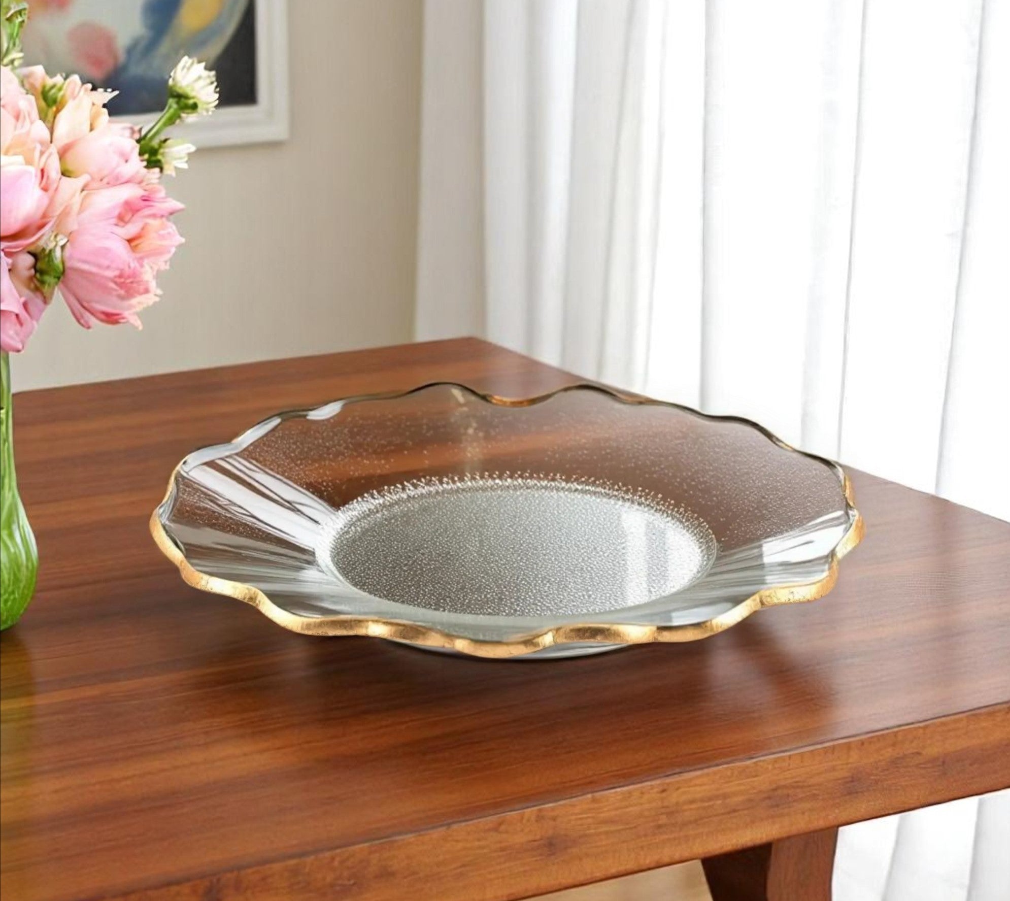 This 10-inch clear and gold glass platter is exactly what you need for entertaining and serving. Beautiful and durable, this glass novelty platter is both the perfect gift and glittering addition to your décor. This platter has a food safe finish. Designed in a glam style, this tray effortlessly enhances any table setting. Its clear and gold hues create a stunning visual contrast, making it an eye-catching piece. Ideal for showcasing appetizers or desserts, this versatile platter adds elegance to your gatherings. 1.5-inch h x 10-inch w x 14-inch d.