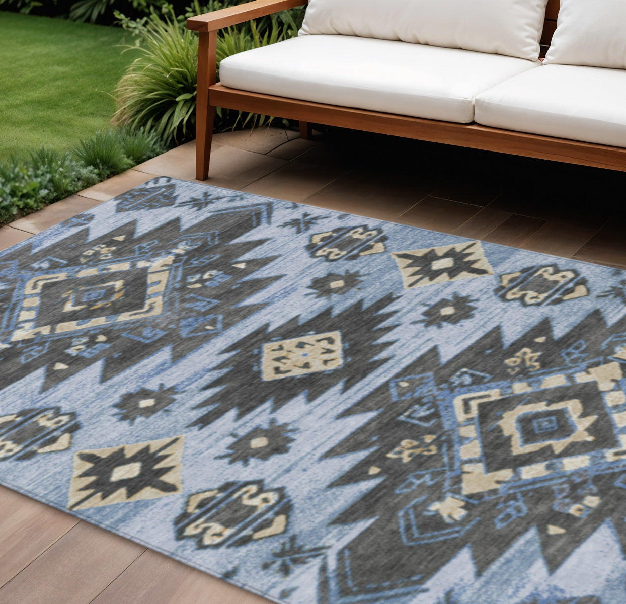10' X 14' Blue And Charcoal Tribal Washable Indoor Outdoor Area Rug